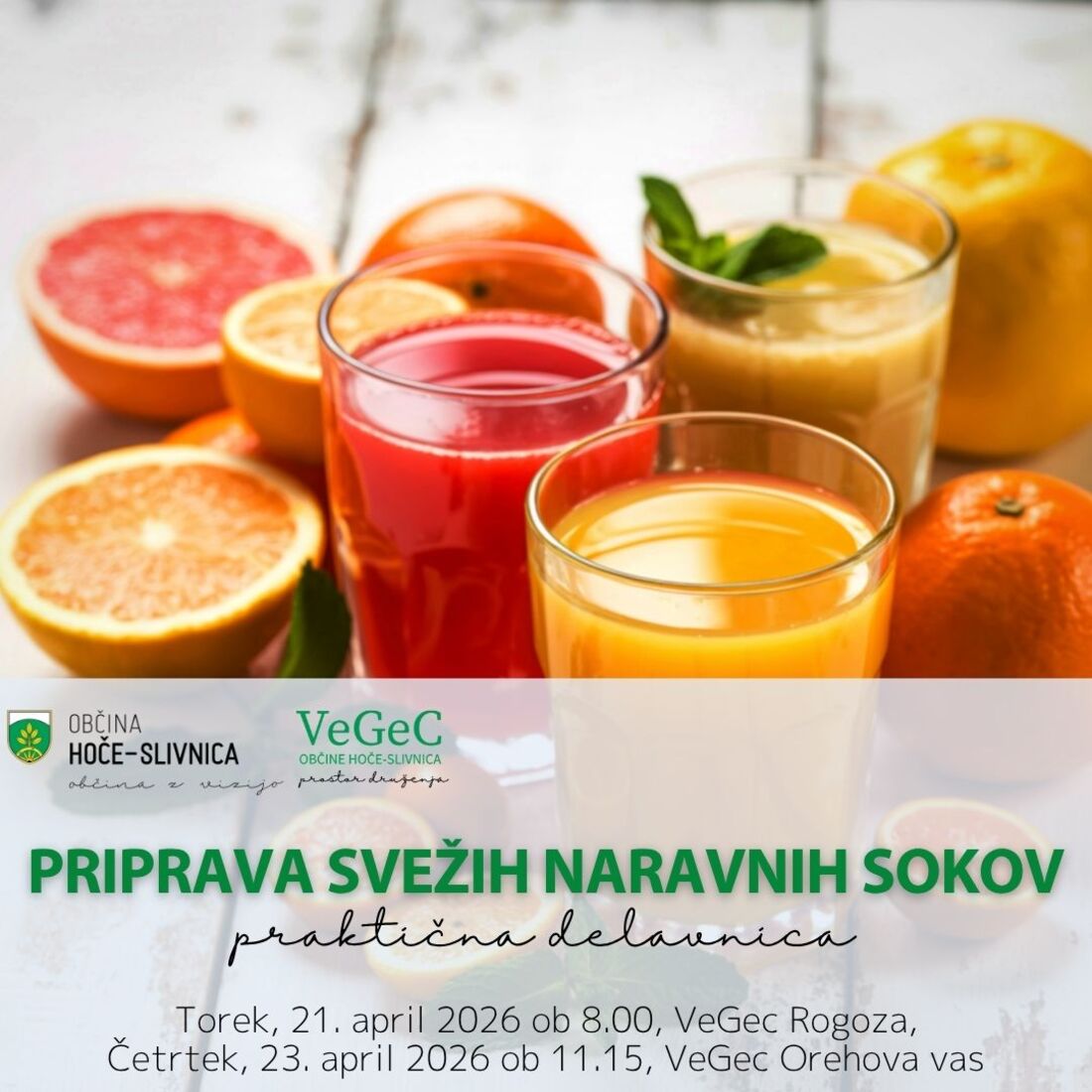 Vabljeni na praktično delavnico Priprava svežih naravnih sokov, ki bo v torek, 21. 4. 2026 ob 8.00 v VeGeC Rogoza in v četrtek, 23. 4. 2026 ob 11.15 v VeGec Orehova vas.