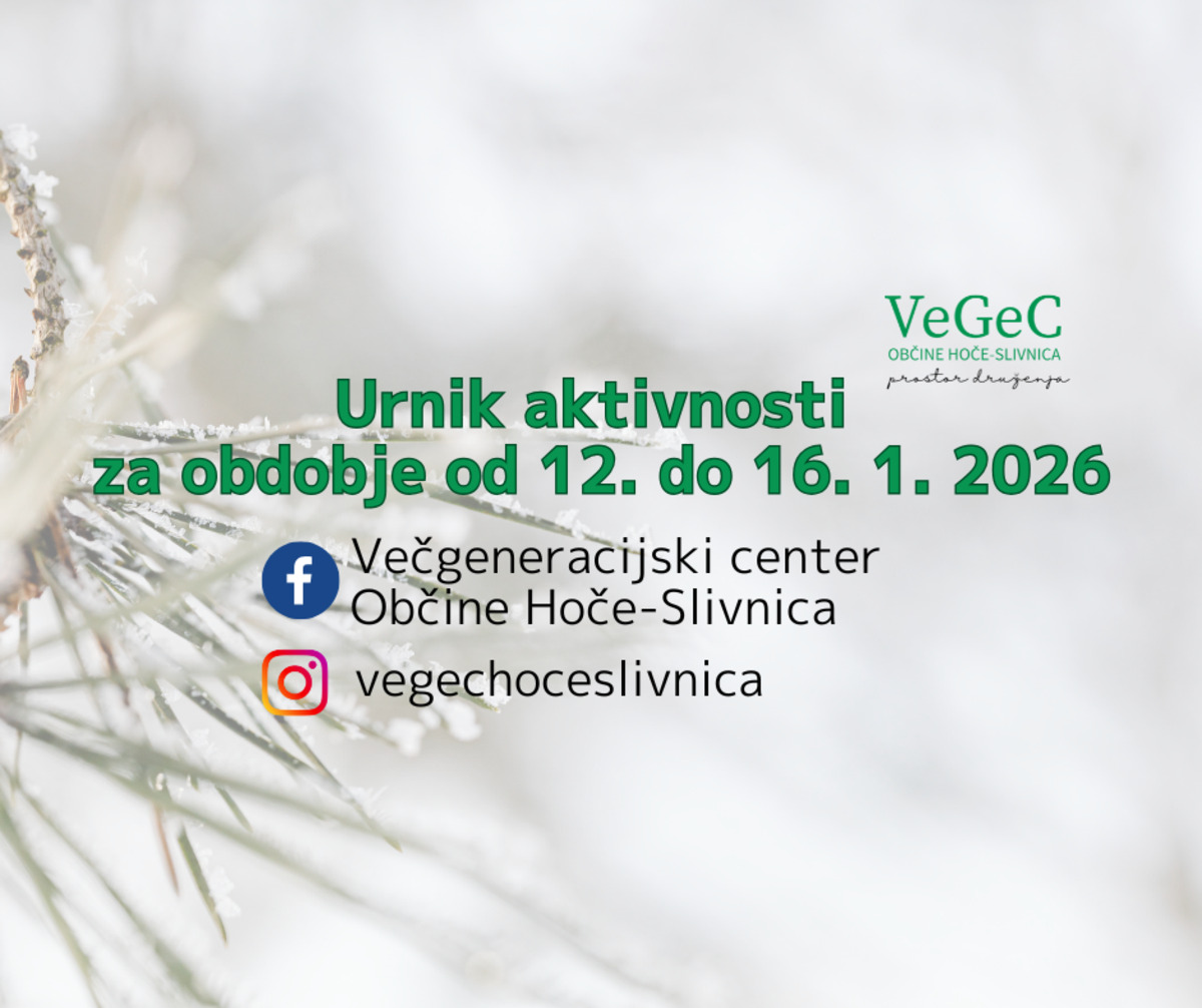Z vami delimo urnik aktivnosti, ki bodo potekale v prostorih Večgeneracijskega centa Občine Hoče-Slivnica od 12. do 16. 1. 2026.