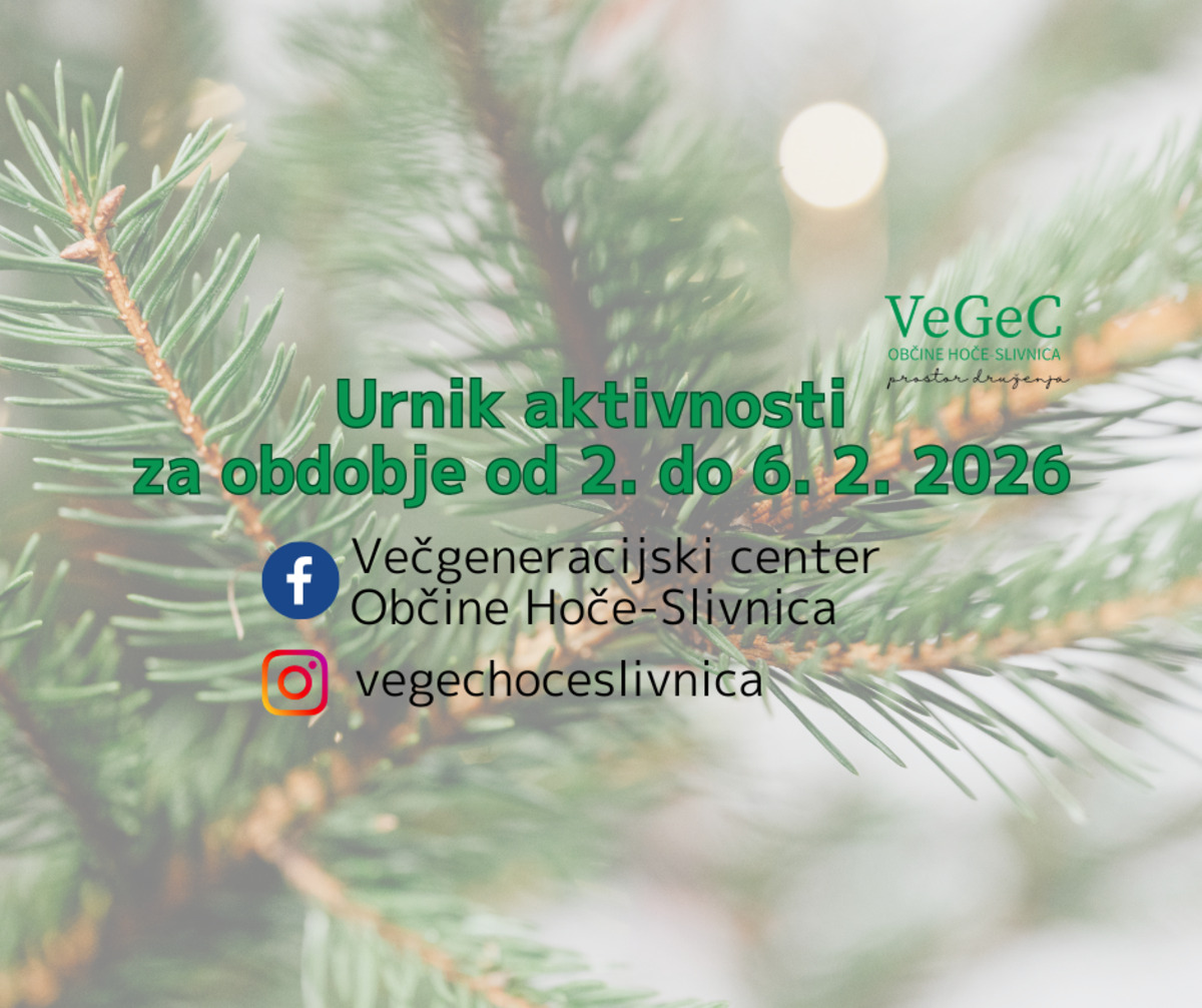 Z vami delimo urnik aktivnosti, ki bodo potekale v prostorih Večgeneracijskega centa Občine Hoče -Slivnica od 2. do 6. 2. 2026.