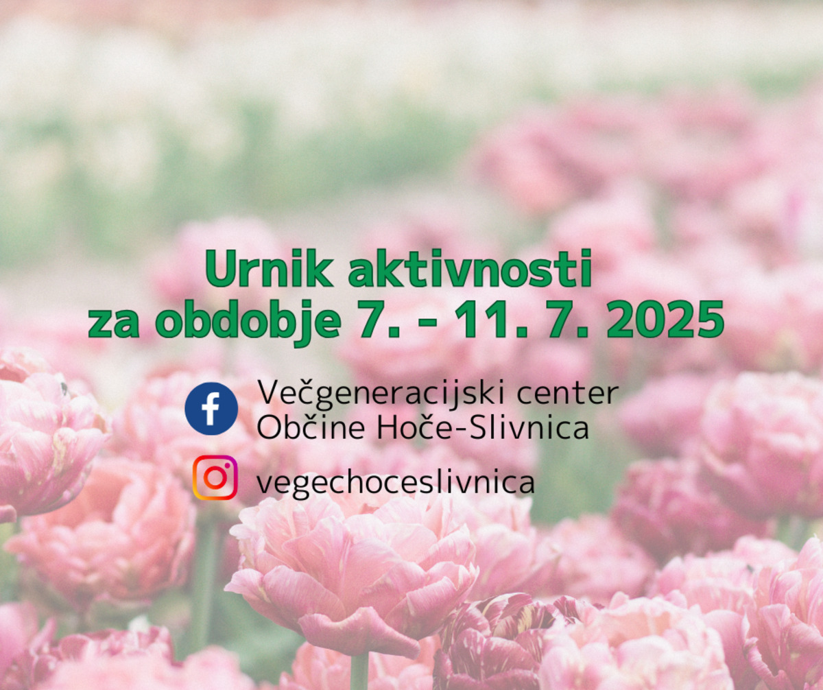 Z vami delimo urnik aktivnosti, ki bodo potekale v prostorih Večgeneracijskega centa Občine Hoče-Slivnica od 7. do 11.7.2025.