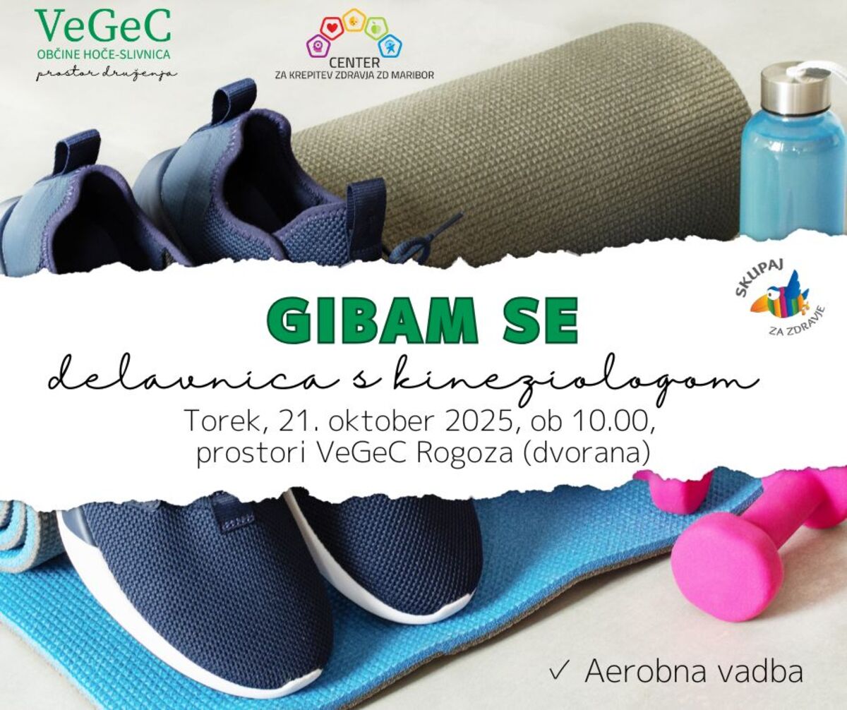 Vabljeni na delavnico "Gibam se", ki bo v torek, 21.10.2025 ob 10. uri v Večgeneracijskem centru VeGeC OHS Rogoza (dvorana).