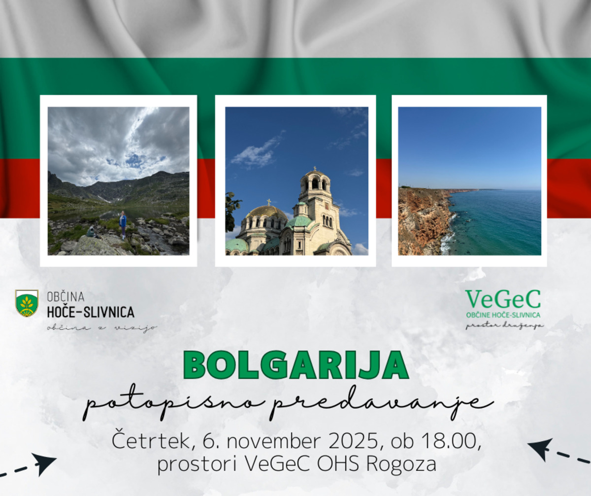 V četrtek, 6.11.2025 ob 18. uri v prostorih VeGeC OHS Rogoza bo predavateljiva Lučka Stopinšek z nami delila vtise potovanja po raznoliki in slikoviti Bolgariji ter predstavitev popestrila s fotografijami, osebnimi izkušnjami in zanimivostmi o kulturi in ljudeh.