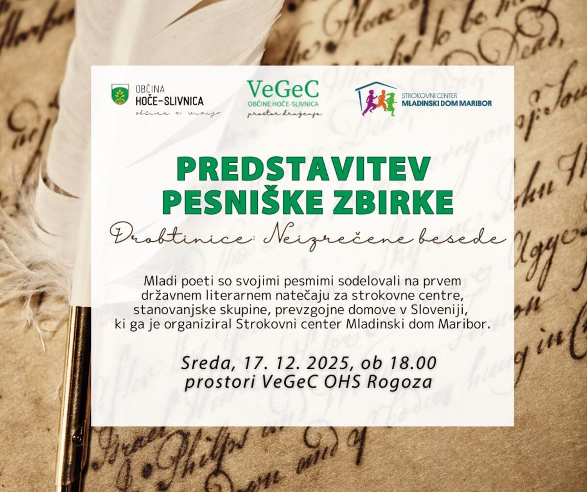 Vabimo vas, da se nam pridružite na predstavitvi pesniške zbirke Drobtinice; Neizrečene besede, ki bo v sredo, 17.12. ob 18. uri v VeGeC OHS Rogoza.