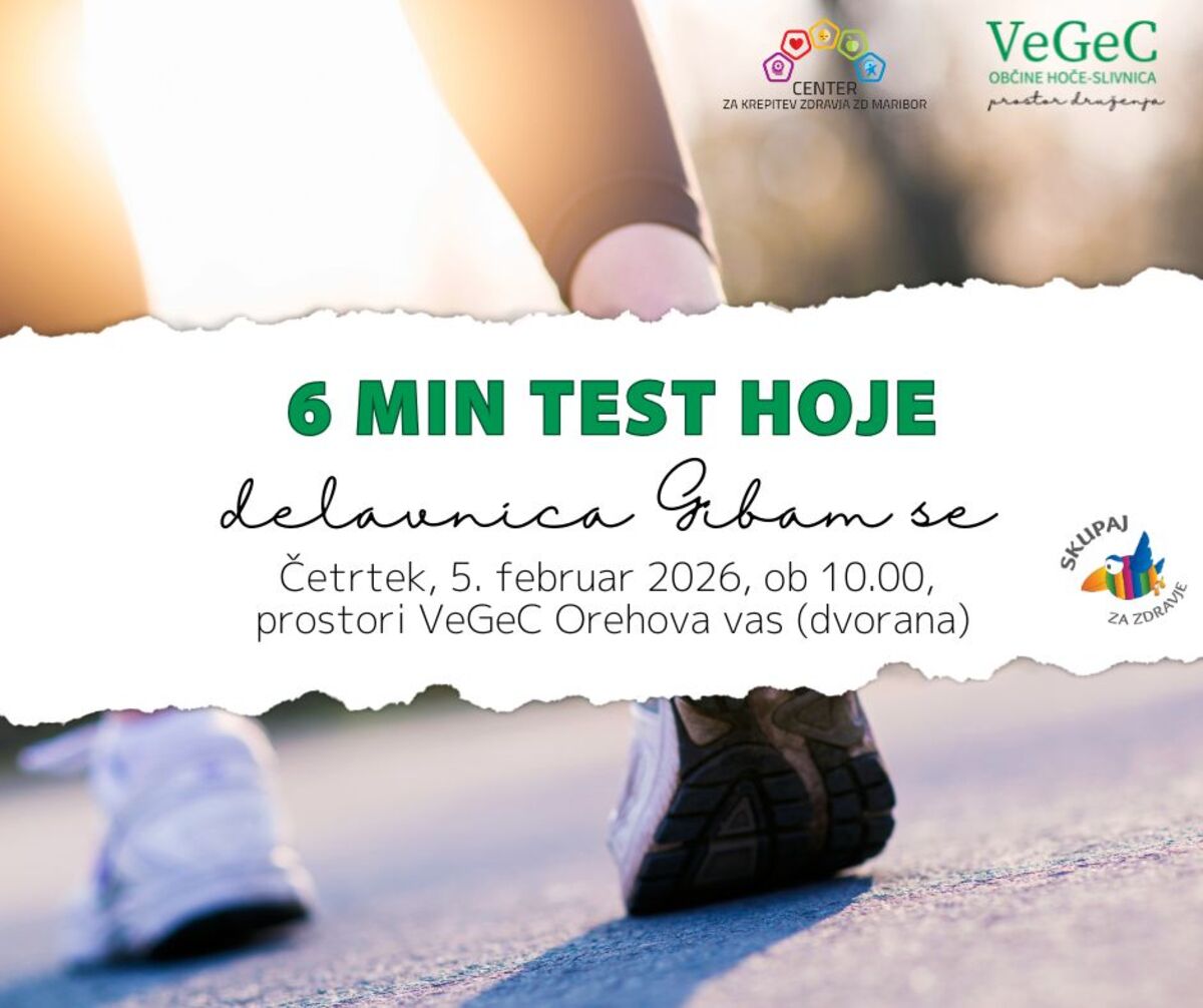 Vabimo vas na delavnico Gibam se - preizkus telesne zmogljivosti s testom hoje, ki bo v sodelovanju s Centrom za krepitev zdravja Maribor potekala v četrtek, 5.2.2026 ob 10.00 v prostorih centra VeGeC v Orehovi vasi (dvorana).
