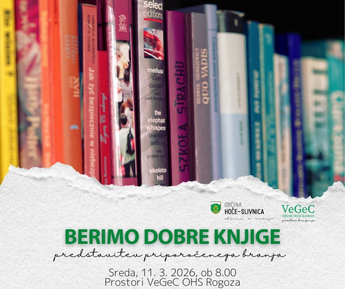 Vabimo vas na delavnico Berimo dobre knjige s predstavitvijo priporočenega branja, ki bo v sredo, 11.3.2026 ob 8.00 v prostorih centra VeGeC OHS Rogoza.