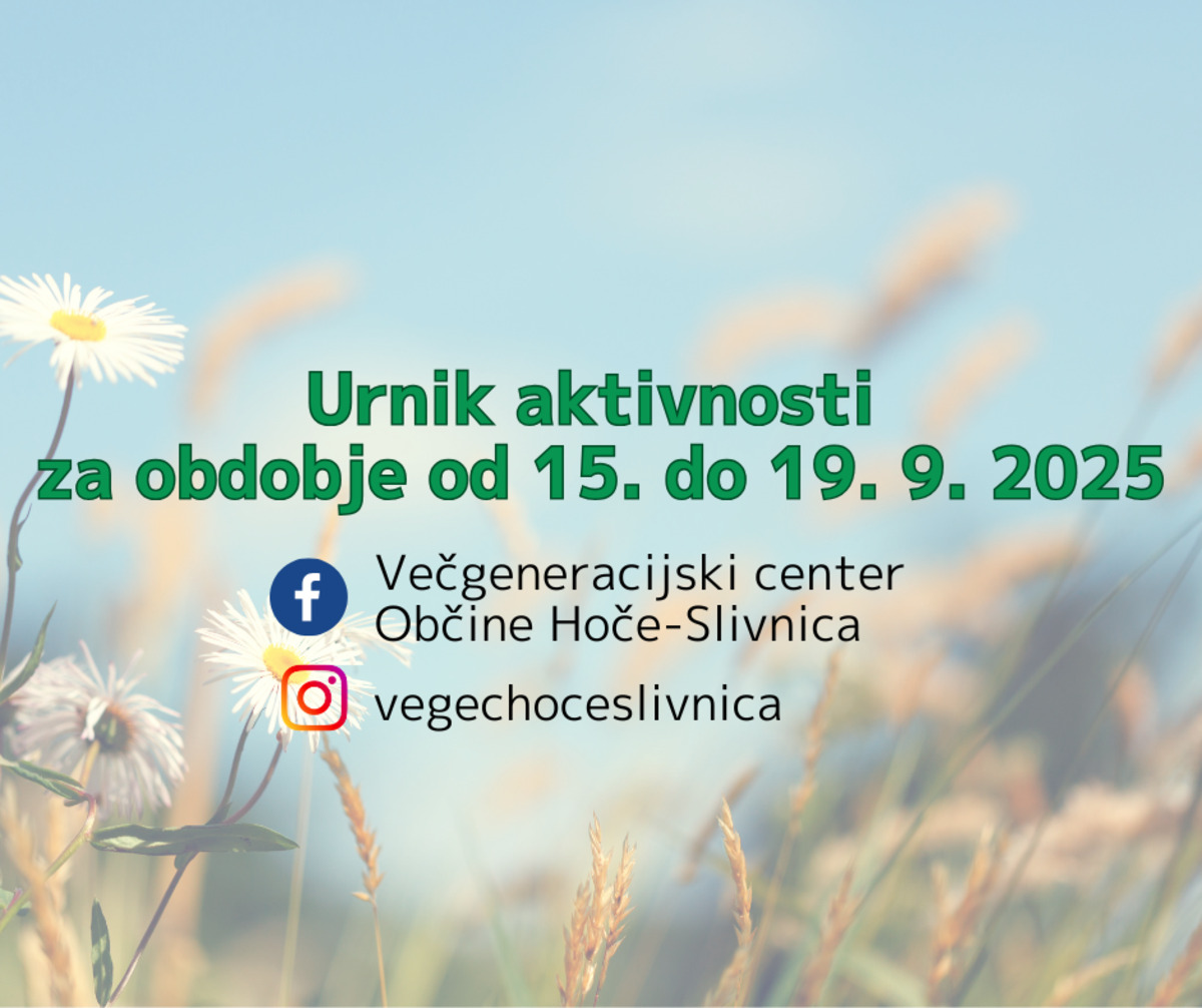Z vami delimo urnik aktivnosti, ki bodo potekale v prostorih Večgeneracijskega centa Občine Hoče-Slivnica od 15. do 19. 9. 2025.