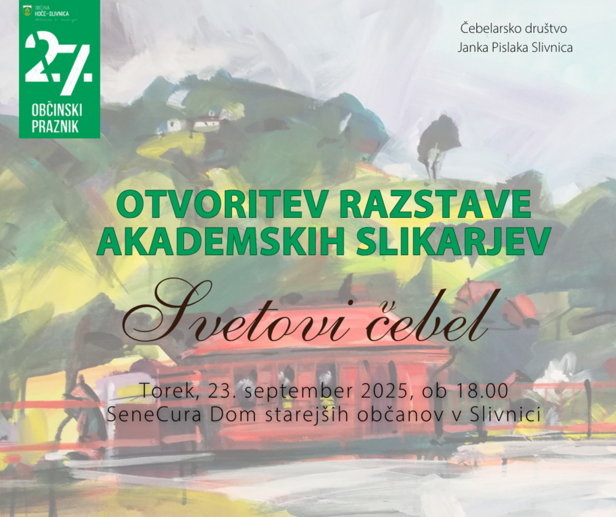 Čebelarsko društvo Janka Pislaka Slivnica vas vabi na otvoritev razstave akademskih slikarjev »SVETOVI ČEBEL«, ki bo potekala v torek, 23. septembra 2025, ob 18. uri v prostorih doma starejših občanov v Slivnici.