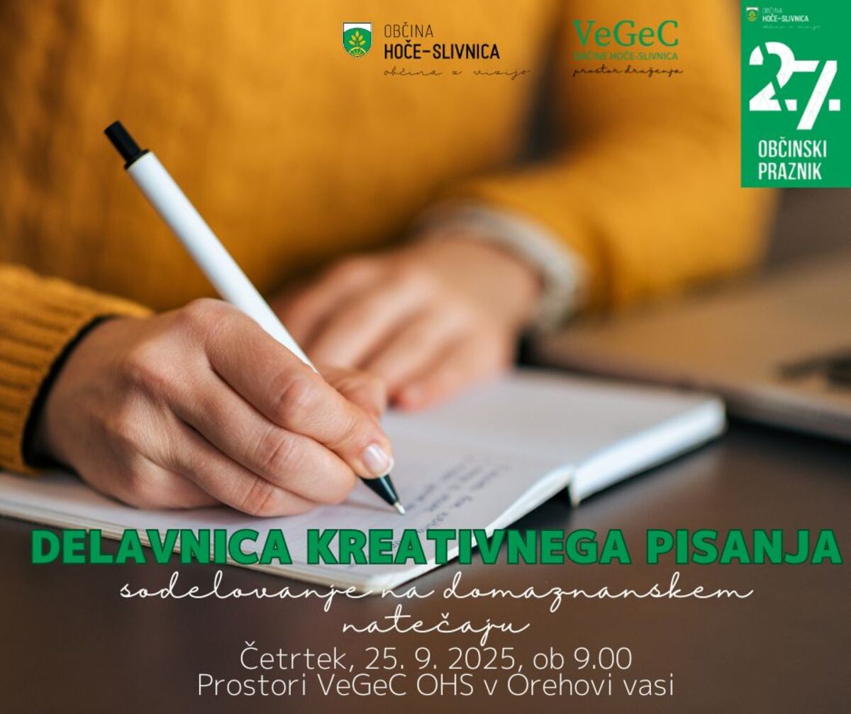 V okviru 27. občinskega praznika Občine Hoče -Slivnica, vas vabimo na delavnico kreativnega pisanja, ki bo v četrtek, 25.9. 2025 ob 9.00 uri v prostorih Večgeneracijskega centra v Orehovi vasi.
