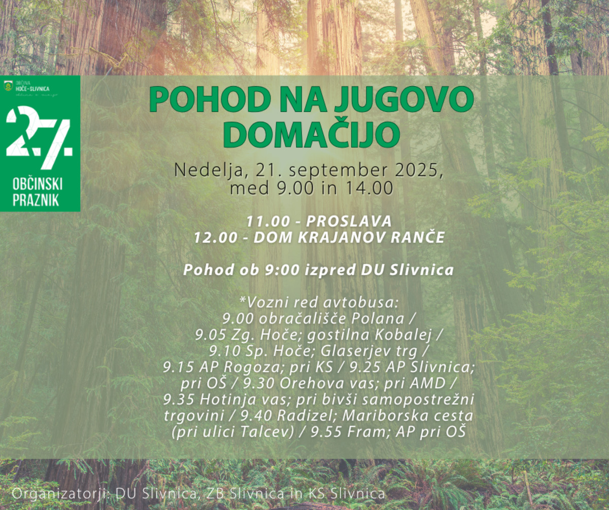 Za udeležence bo organiziran tudi avtobusni prevoz po ustaljenem voznem redu (9.00 obračališče Polana/ 9.05 Zg. Hoče; gostilna Kobalej/ 9.10 Sp. Hoče; Glaserjev trg/ 9.15 AP Rogoza; pri KS/ 9.25 AP Slivnica; pri OŠ/ 9.30 Orehova vas; pri AMD/ 9.35 Hotinja vas; pri bivši samopostrežni trgovini/ 9.40 Radizel; Mariborska cesta (pri ulici Talcev)/ 9.55 Fram; AP pri OŠ).