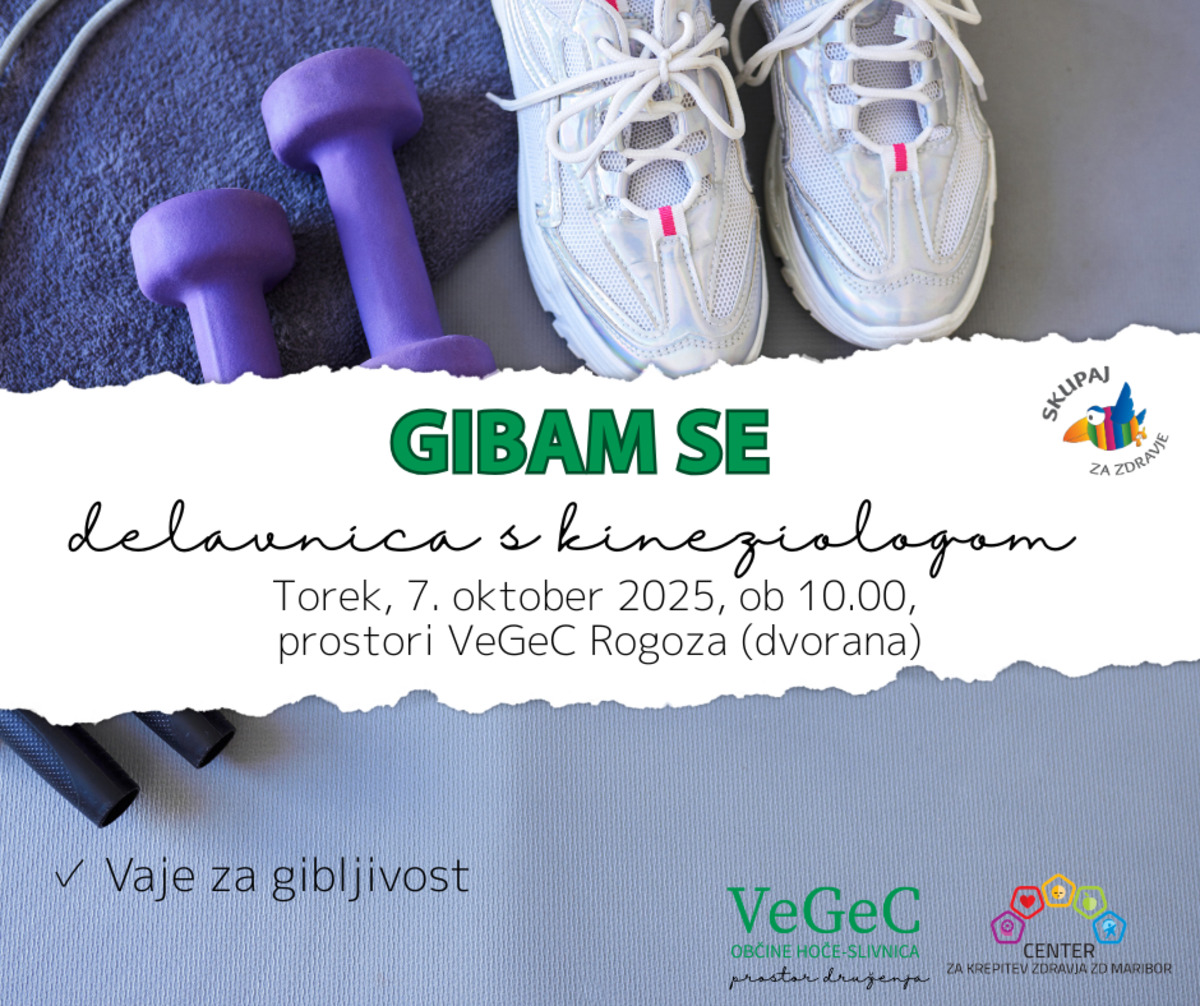 Vabljeni na delavnico "Gibam se", ki bo v torek, 7.10.2025 ob 10. uri v Večgeneracijskem centru VeGeC OHS Rogoza (dvorana).
