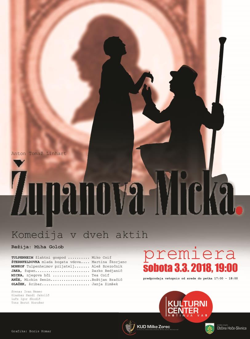 Vljudno vabljeni na premierno komedije v dveh dejanjih Županova Micka (Anton Tomaž Linhart) - v izvedbi Dramske skupine KUD Milke Zorec. Pod režisersko taktirko Mihe Goloba.