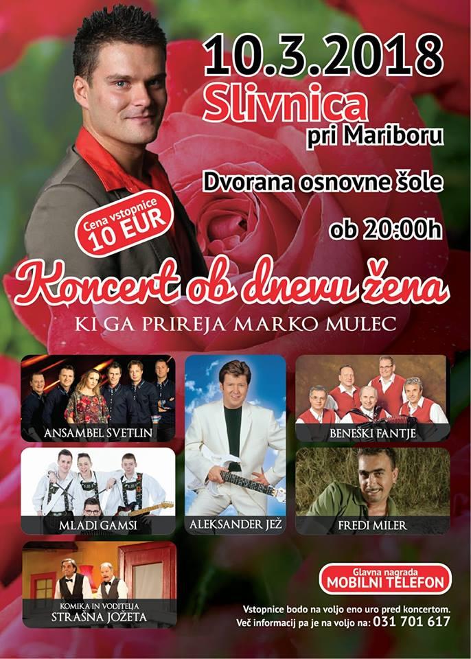 Vabljeni na koncert ob dnevu žena, ki ga prireja Marko Mulec. Koncert bo v soboto, 10. marca 2018, s pričetkom ob 20. uri, v telovadnici OŠ Franca Lešnika Vuka v Slivnnici.