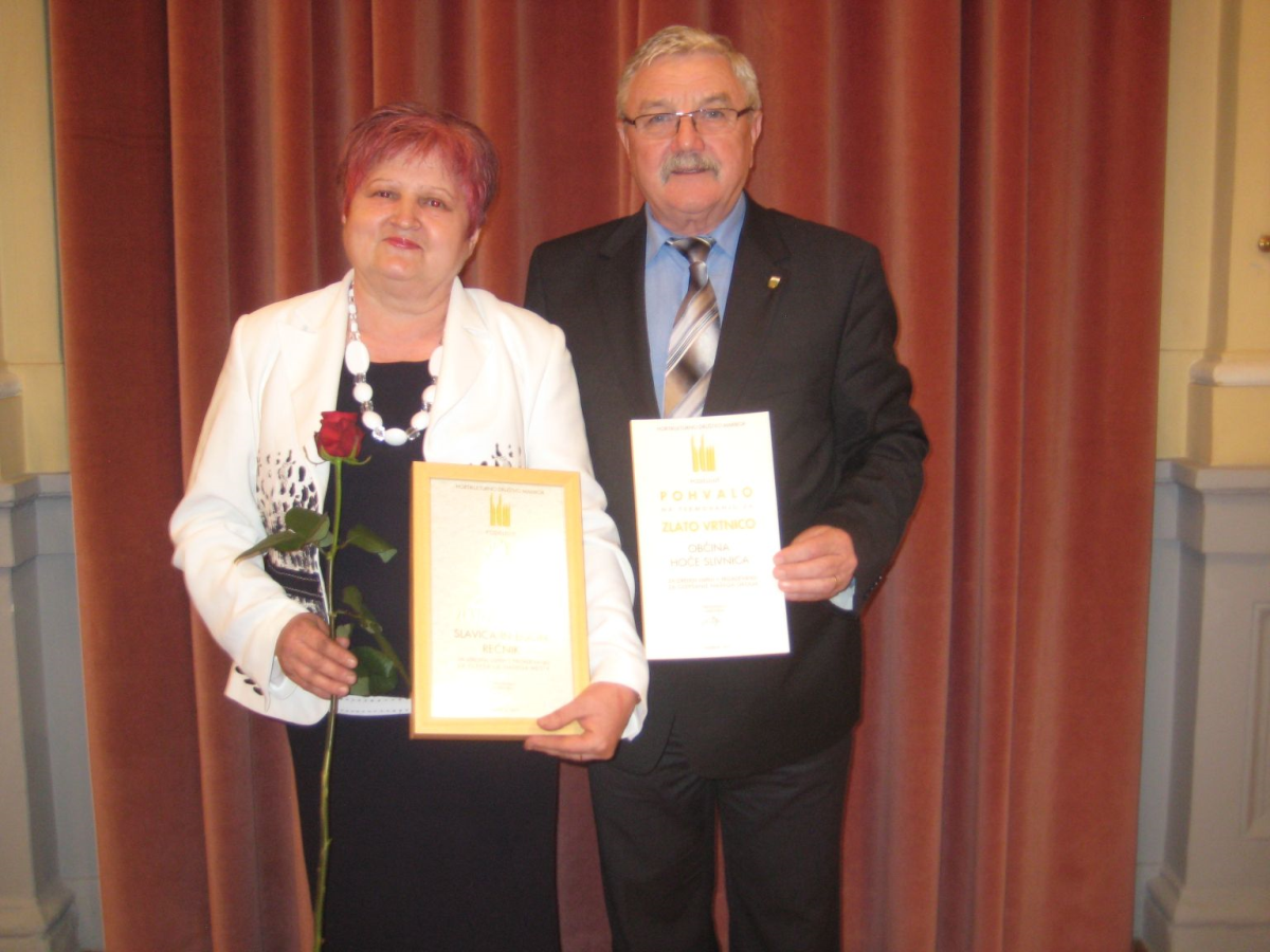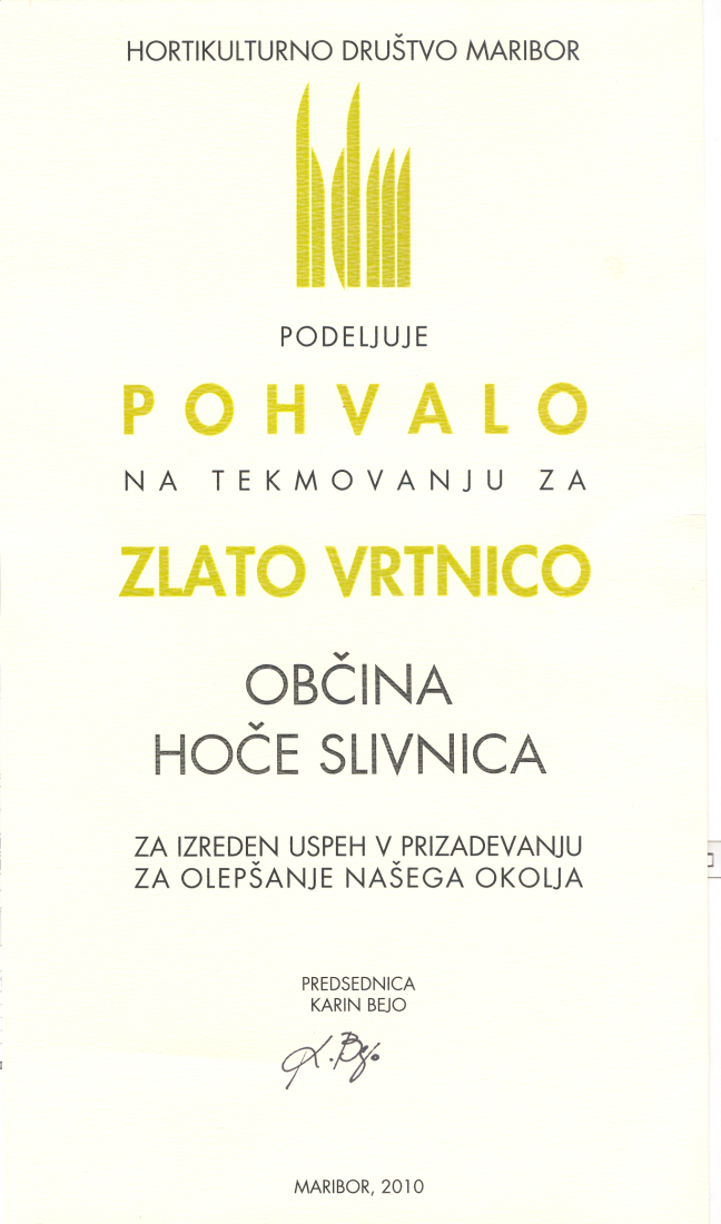 16. marca je v Narodnem domu potekala slavnostna podelitev priznanj za lepo urejeno okolje, ki jo prireja hortikulturno društvo. Podeljenih je bilo 25 zlatih vrtnic in 315 pohval. Med dobitniki pohval na tekmovanju za Zlato vrtnico je bila tudi naša občina. Župan Občine Hoče-Slivnica g. Jože Merkuš je vesel, da se opazijo naša prizadevanja za urejeno okolje. Naj bo priznanje Zlata vrtnica tudi spodbuda za vse nas, ki bivamo v naši občini za nadaljnje prizadevanje za čisto in urejeno okolje. Tako kot sta za čudovito, s cvetjem obdano okolje med 25 dobitniki, največje priznanje ZLATO VRTNICO, prejela Slavica in Egon Rečnik. Nihče tistih, ki je že bil pri njiju, ne dvomi, da sta si to priznanje povsem zaslužila. Tudi za to, ker sta kljub temu, da je v sklopu hiše tudi avto mehanska delavnica, ki običajno s kupi pločevine ni vedno videti prijazna okolju, okolico poleg ribnika zasadila z ogromno cvetjem, ki cveti od rane spomladi do pozne zime.