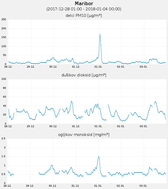 Prikaz vsebnosti delcev PM10 v zraku od 28. 12 2017 do 4. 1. 2018 – vrh prikazuje uporabo pirotehničnih sredstev ob koncu leta 2017