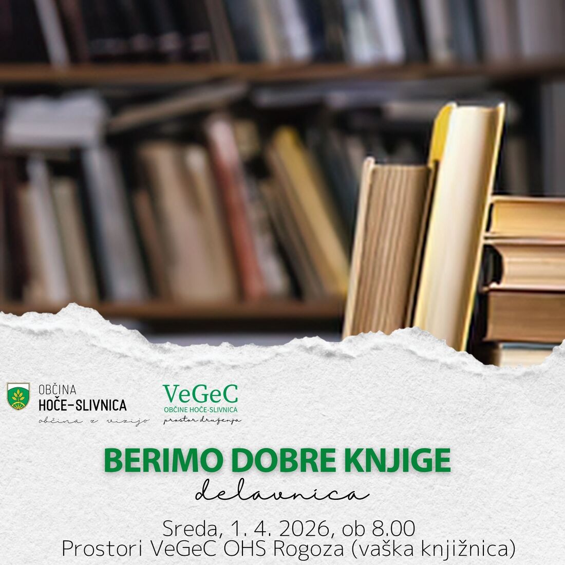 Vabimo vas na delavnico Berimo dobre knjige, s predstavitvijo Vaške knjižnice, ki bo v sredo, 1. 4. 2026 ob 8.00 v centru VeGeC OHS Rogoza.