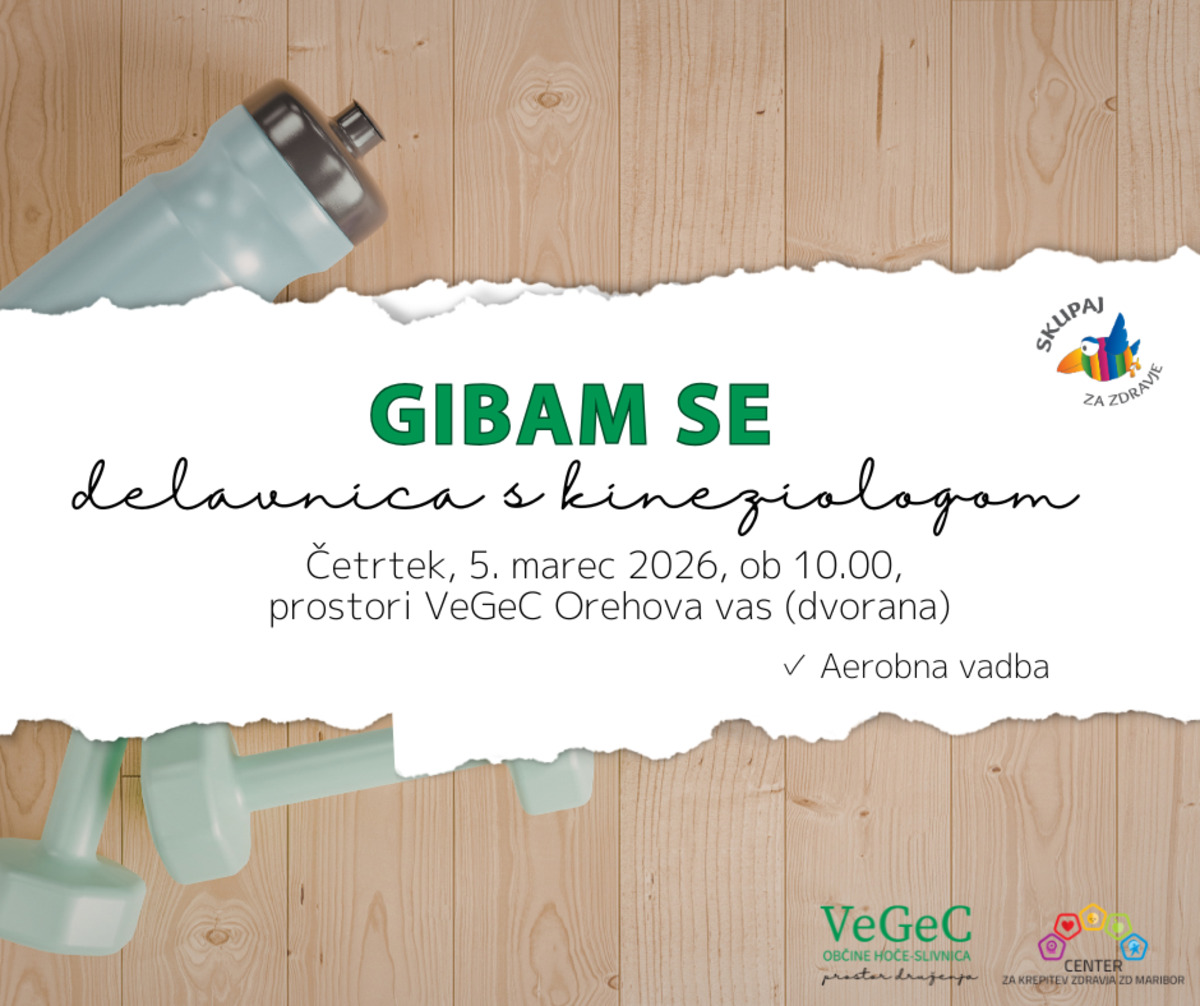 V sklopu sodelovanja s Centrom za krepitev zdravja Maribor vas vabimo, da se nam priružite na delavnici Gibam se, ki bo v četrtek, 5. 3. 2026, ob 10. uri v prostorih centra v Orehovi vasi (dvorana).