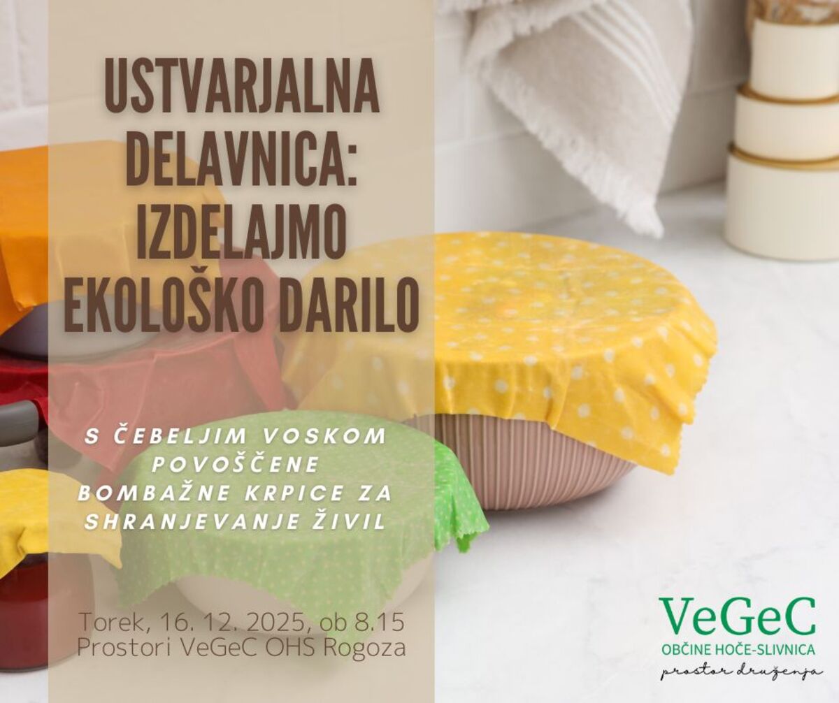 Vabimo vas na ustvarjalno delavnico »Izdelajmo ekološko darilo: s čebeljim voskom povoščene bombažne krpice za shranjevanje živil«, ki bo v torek, 16. 12. 2025, ob 8.15 v prostorih našega centra v Rogozi. Na delavnici bomo spoznali celoten postopek voskanja s čebeljim voskom in ustvarili svoje trajnostne izdelke.