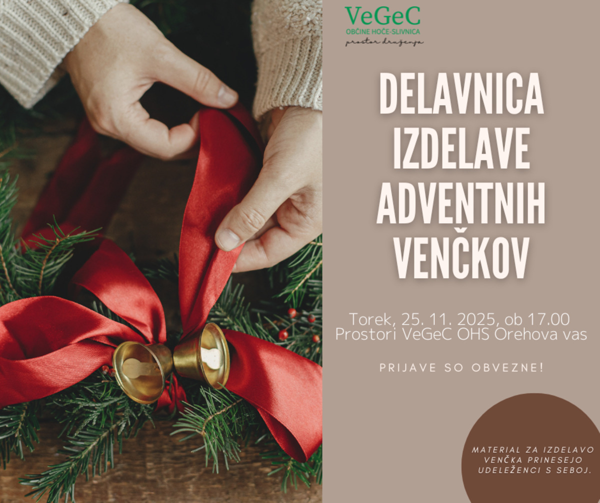 Vabimo vas na ustvarjalno delavnico izdelovanja adventnih venčkov, ki bo v torek, 25.11.2025 ob 17. uri v prostorih VeGeC OHS Orehova vas.