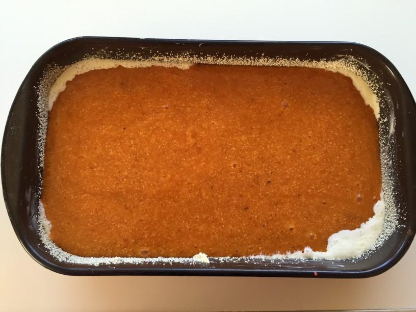 Enakomerno razdelimo kaki po posodi, po kakijevem nadevu potresemo preostanek suhe zmesi.