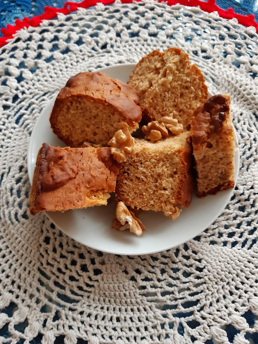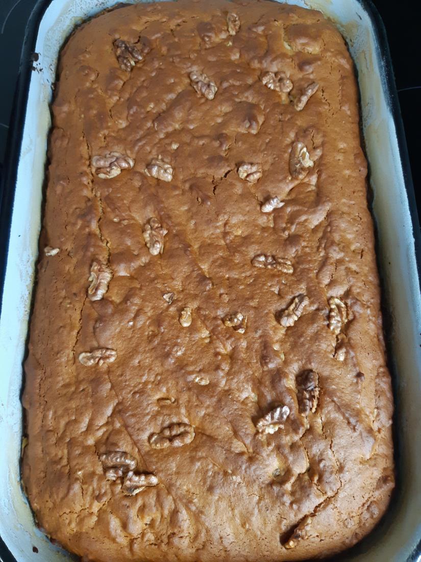 Jajce in sladkor dobro premešamo in postopoma dodajamo polovico gladke moke. Sestavini margarina in med na kuhalni plošči stopimo ter pustimo hladit. Stopljeni sestavini dodamo k masi in počasi in z občutkom mešamo. Dodamo še zadnje sestavine cimet moko ter pecilni prašek. Gotovo zmes damo v pekač in po želji na vrhu naložimo oluščene mandlje in orehe. Pečemo 40 minut na 180 stopinj C.