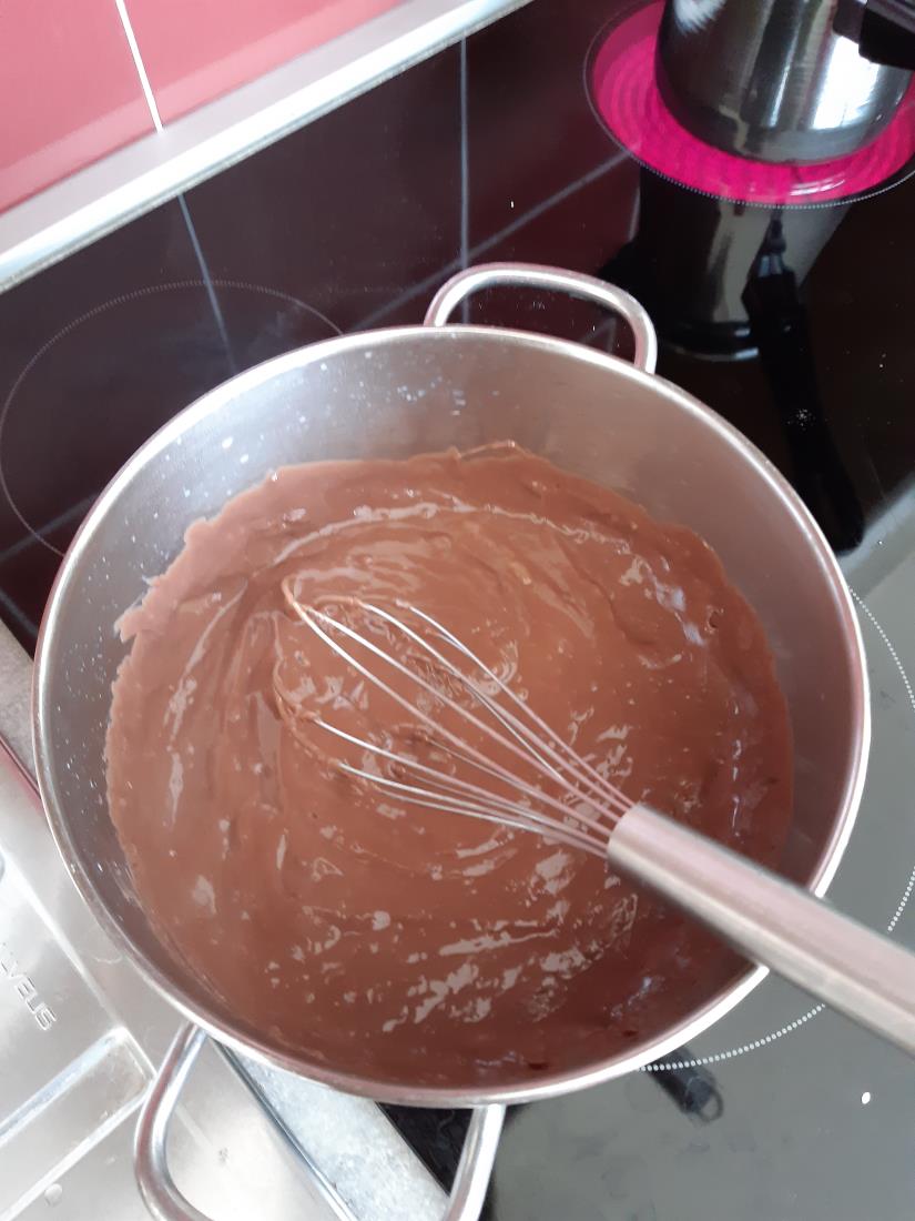 V začetku skuhamo po navodilih čokoladni puding in ga pustimo, da se ohladi. Medtem pripravimo sadje, ki ga narežemo po koščkih za lažji nadev na biskvitno površino.