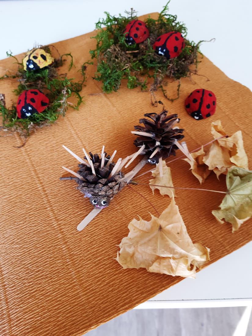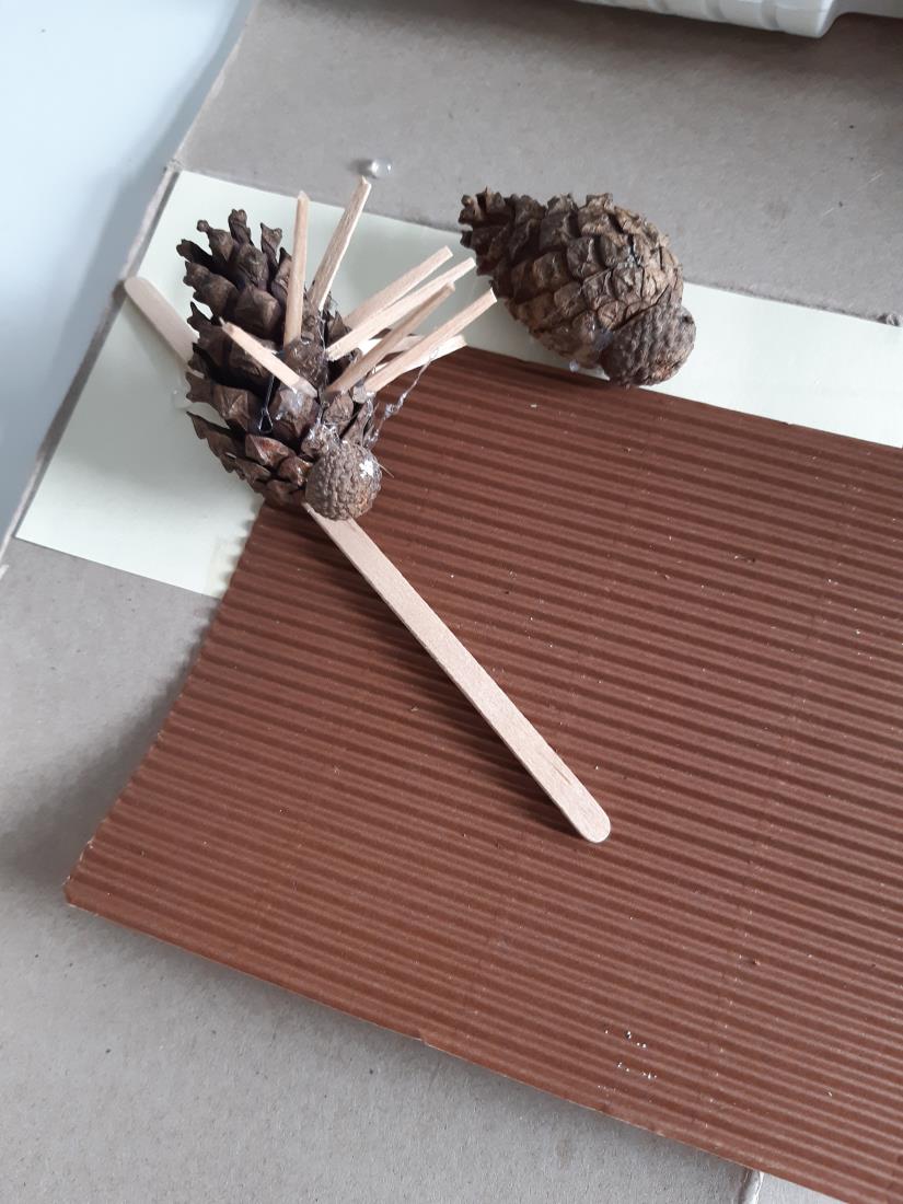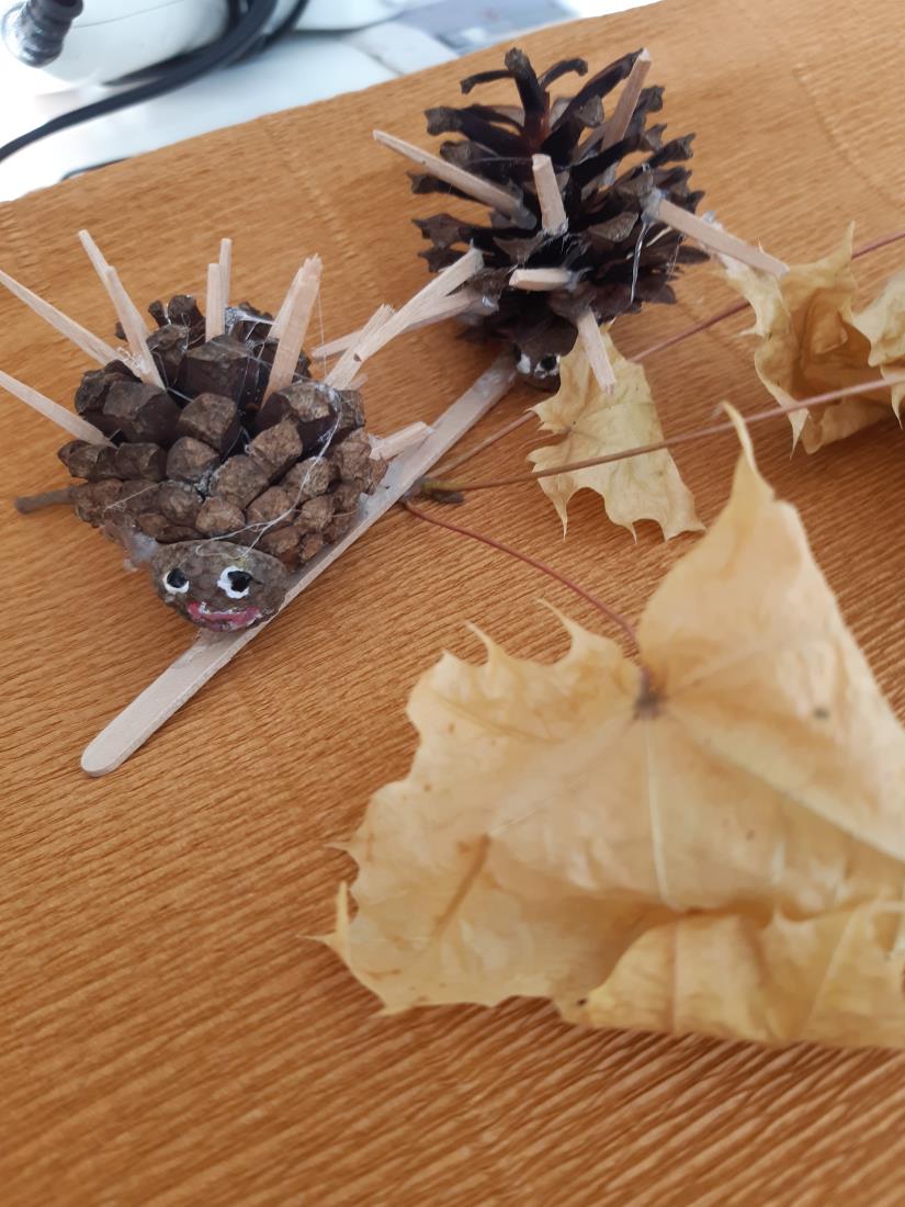 Za ježka vzamemo storž na katerega z vročim lepilom pritrdimo zobotrebce, ki jih po želji razporedimo. Pri bodicah bodite čim bolj ustvarjalni. V kolikor so vam zobotrebci preveliki jih lahko z rezilom skrajšamo. Nato za nosek vzamemo kapico želoda, ki jo prilepimo na sprednji del storža. Nadalje izrišemo nad noskom z belo kredo oči. Končan ježek pritrdimo na leseno palčko ali ga poljubno postavimo na vidno in želeno mesto.
