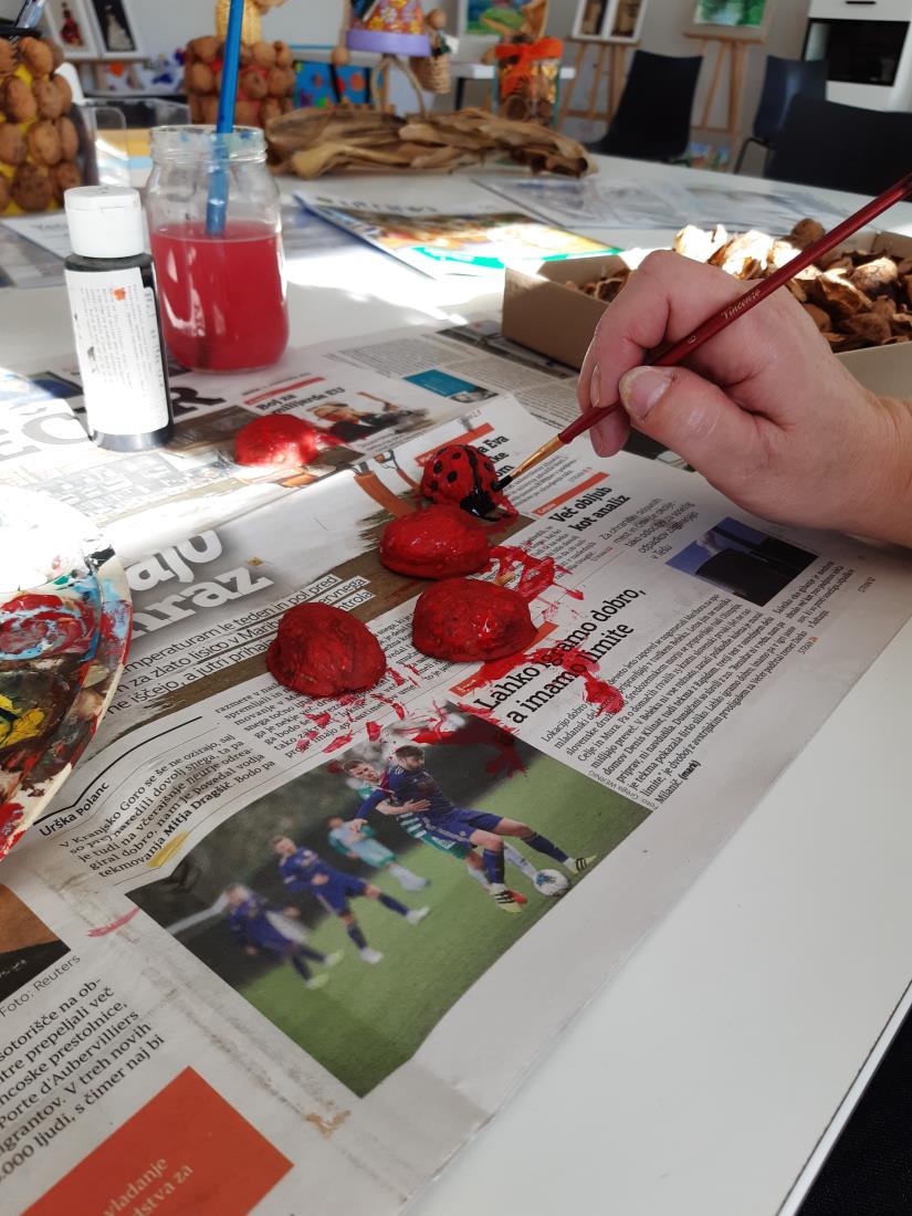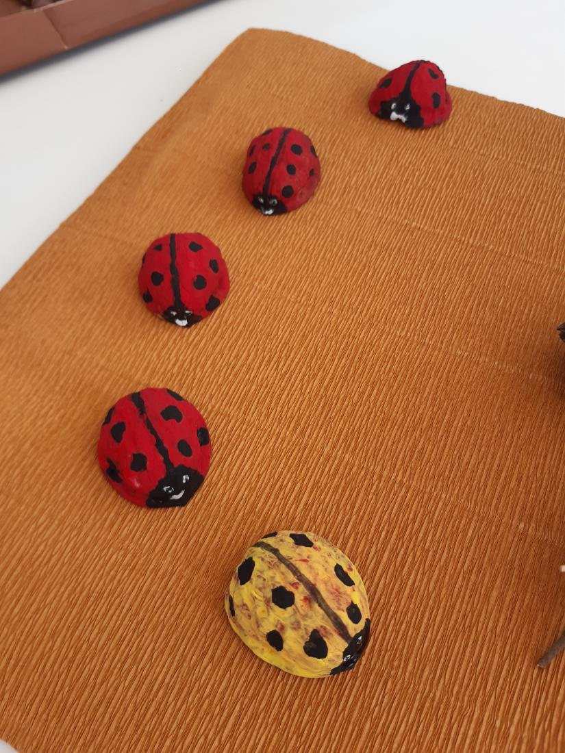 Za izdelavo pikapolonice potrebujemo orehovo luščino, katero s pomočjo čopiča z rdečo tempero obarvamo. Na obarvano rdečo ploskev s čopičem izrišemo črne pike ter oči. Z belo tempero še obarvamo sredico očke.