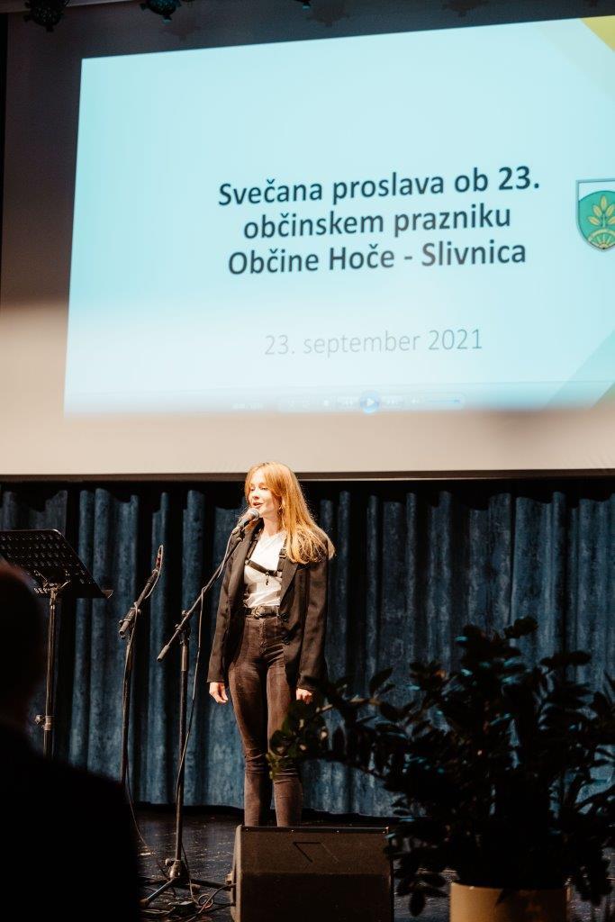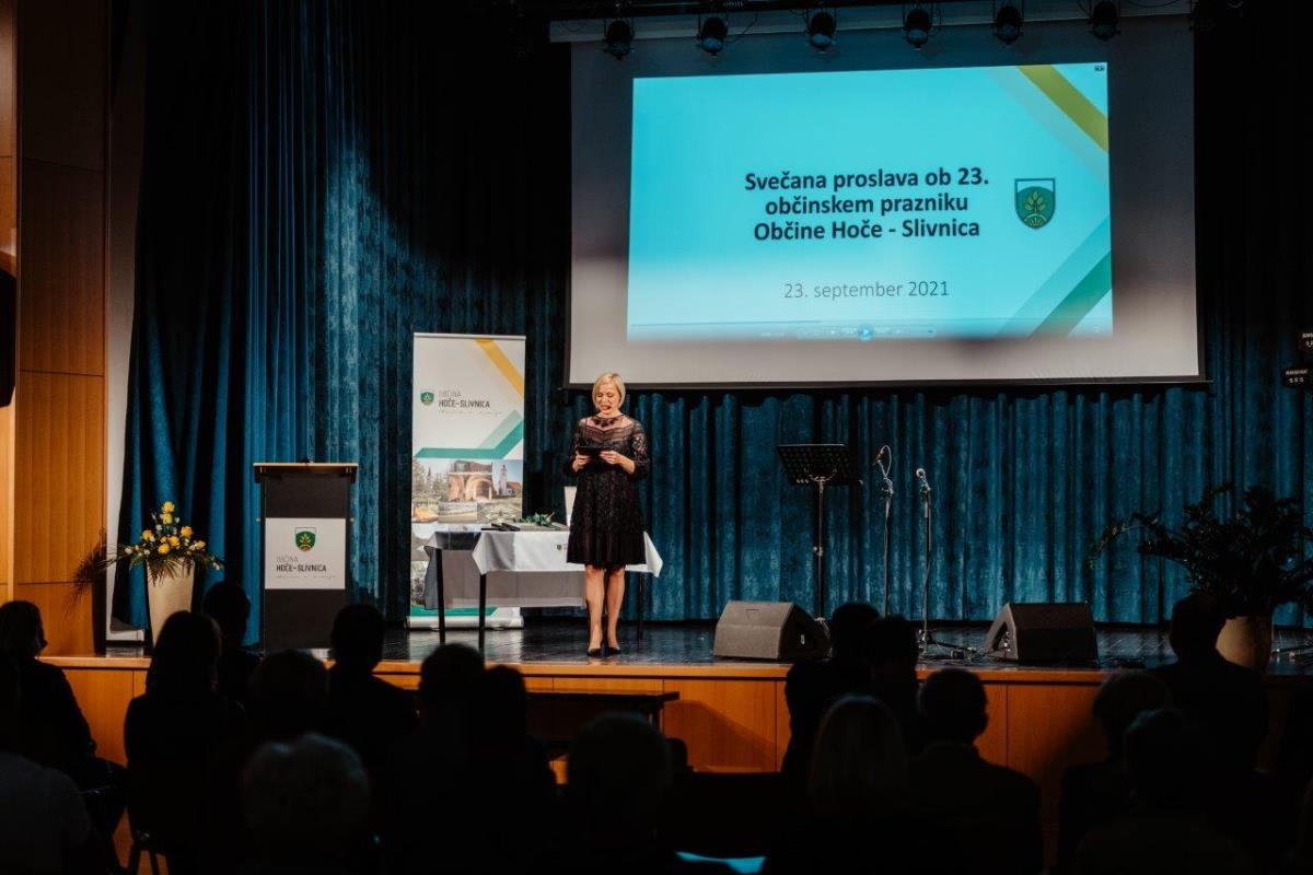 Osrednja občinska svečanost s podelitvijo priznanj in nagrad Občine Hoče - Slivnica je bila v četrtek, 23. septembra 2021. S svojim prijetnim glasom in nastopom jo je povezovala Mojca Lubanjšek Pehant, ki je po slovenski himni tako pozdravila številne obiskovalce: »Dober večer, dragi občanke in občani Občine Hoče - Slivnica, in dobrodošli na proslavi ob prazniku naše občine. Čudni časi še kar vztrajajo in marsikaj je drugače, kot smo bili vajeni in kot bi si želeli. Pa vendar določene stvari ostajajo iste in nekatere se spreminjajo tako, da nam je to všeč. Samo videti jih moramo. Naši kraji so še vedno lepi – pravzaprav še lepši, naši sosedje še vedno enako dobri in najbolj prizadevnim v občini se še vedno na lep način poklonimo. Veliko je tudi v teh čudnih časih lepega. Verjamem, da bo tudi nocojšnji večer lep, ker si bomo takšnega naredili.«