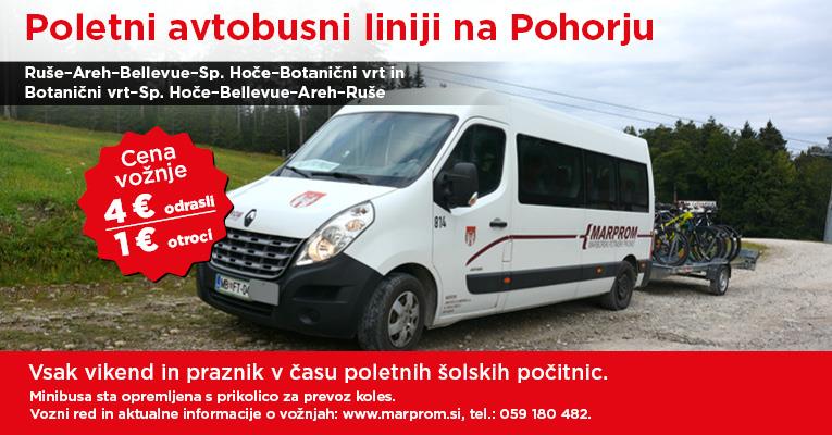 Ob nastopu poletnih počitnic bo podjetje Marprom iz Skupine JHMB 24. junija znova pričelo izvajati prevoz na dveh posebnih avtobusnih linijah, speljanih čez Pohorje: eni na relaciji Ruše–Areh–Bellevue–Sp. Hoče–Botanični vrt in drugi Botanični vrt–Sp. Hoče–Bellevue–Areh–Ruše. Minibusa na teh linijah, opremljena s prikolico za kolesa, bosta vozila ob sobotah, nedeljah in praznikih; cena enosmerne vozovnice bo 4 EUR za odrasle in 1 EUR za otroke (za transport koles ni potrebno doplačilo).