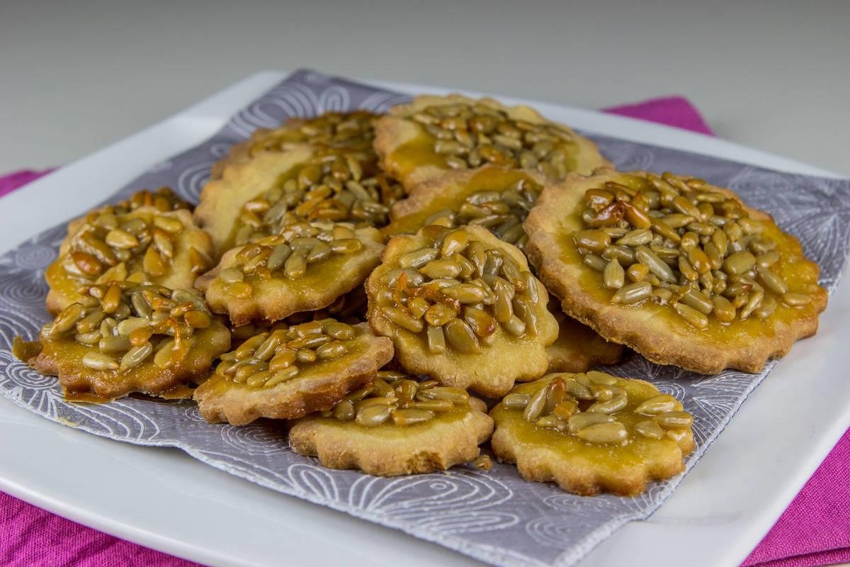 Medtem segrejemo ponev in damo vanjo sončnična semena, 50 g margarine, med in sladko smetano. Povremo in pripravljeno zmes ohladimo. Vanjo naribamo še pomarančno lupino.