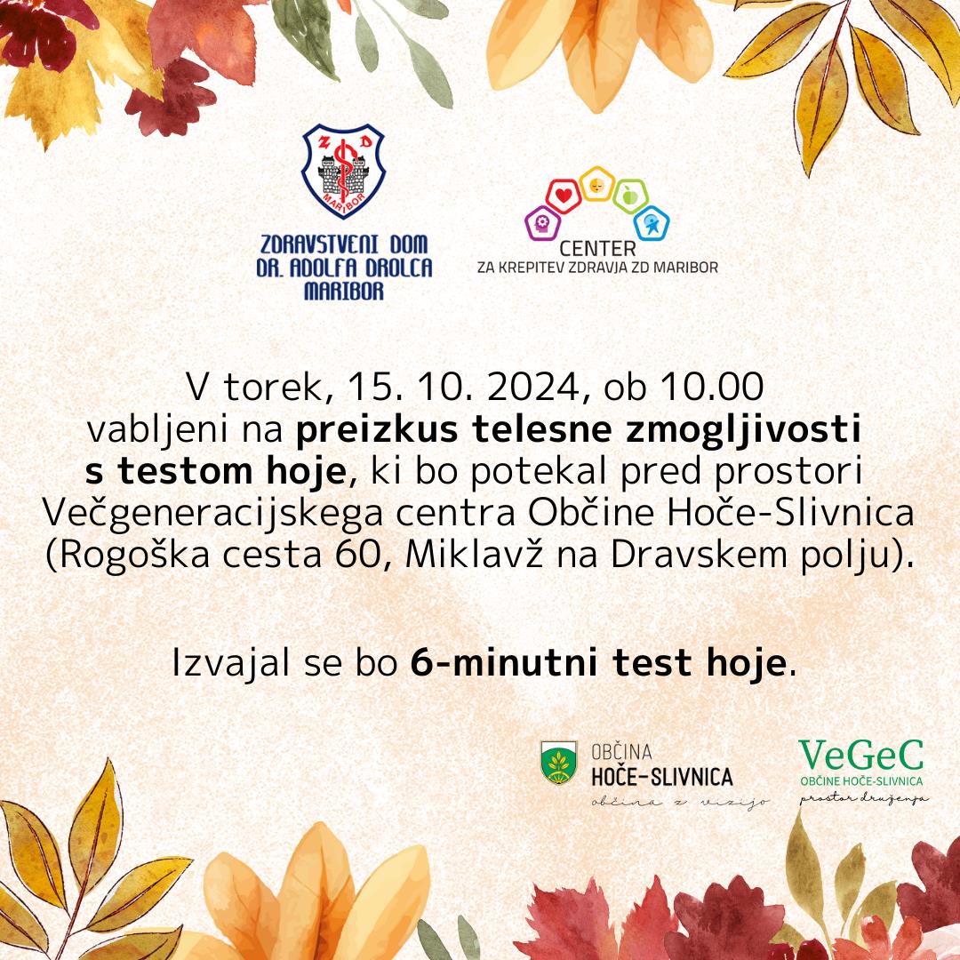 Center za krepitev zdravja Maribor vas vabi na preizkus telesne zmogljivosti s testom hoje, ki bo potekal v torek, 15. 10. 2024, ob 10.00 pred prostori Večgeneracijskega centra Občine Hoče-Slivnica (Rogoška cesta 60, 2204 Miklavž na Dravskem polju).