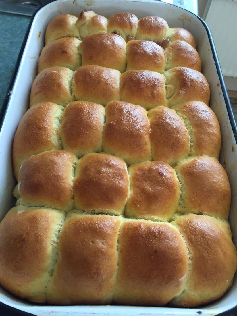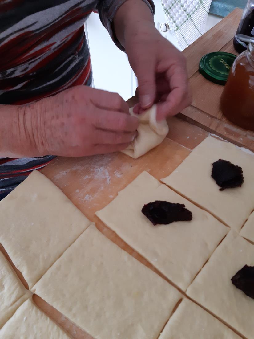 Predlagamo, da mešate na robota. Če ga nimamo, uporabimo električni mešalnik ali uporabimo metlico za testo. Moko med mešanjem dodajamo postopoma. Ko testo temeljito pregnetemo, ga pustimo v posodi, da vzhaja in podvoji volumen. Posodo pokrijemo s krpo. Načeloma je ena ura dovolj, da testo naraste in podvoji volumen. Delovni pult pomokamo z ostro moko in naj predenemo vzhajano testo. Testo razdelimo na 20 enako težkih kupčkov. Kos testa rahlo potlačimo in nanj položimo žličko marmelade. Nato konec testa zlepimo in oblikujemo kroglico oz. buhtelj. Podobno kot bi delali krofe.