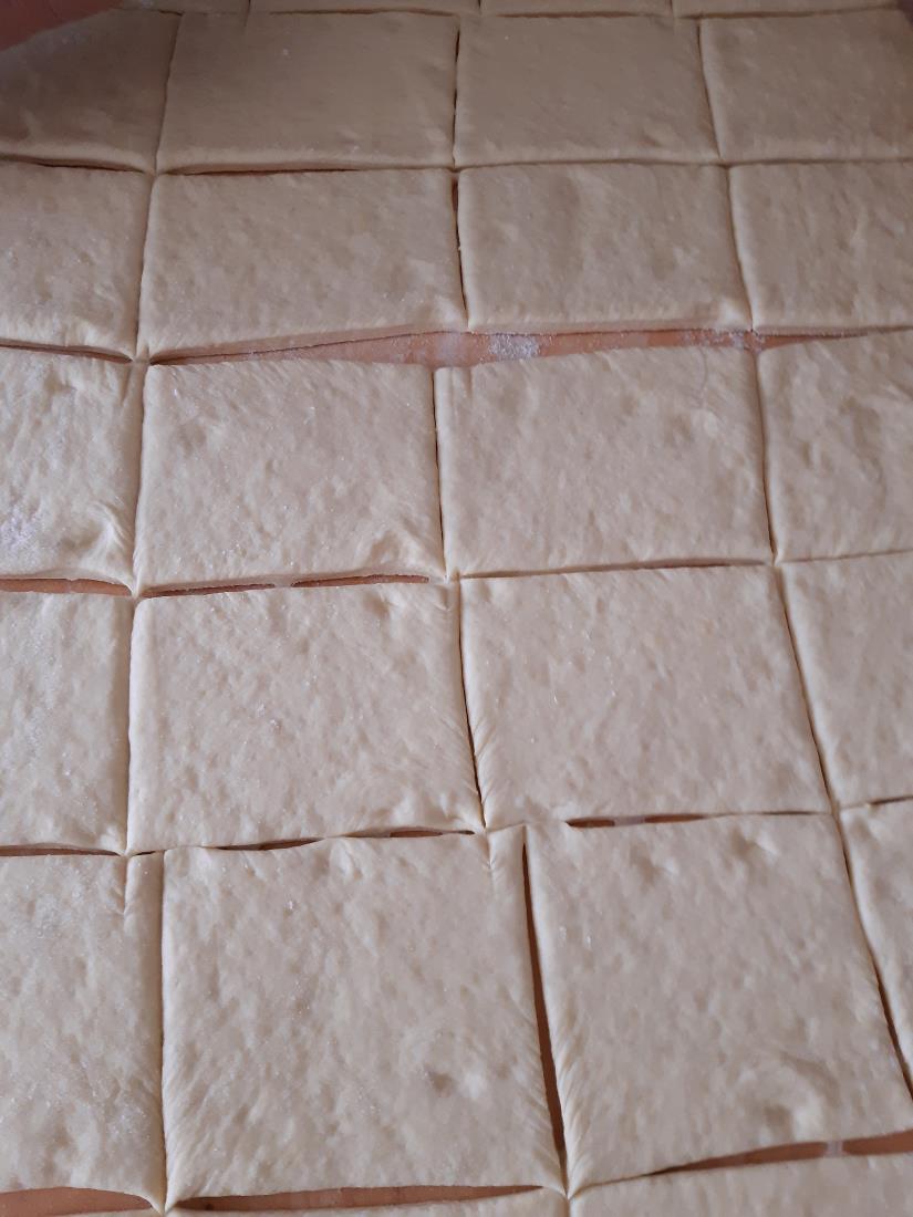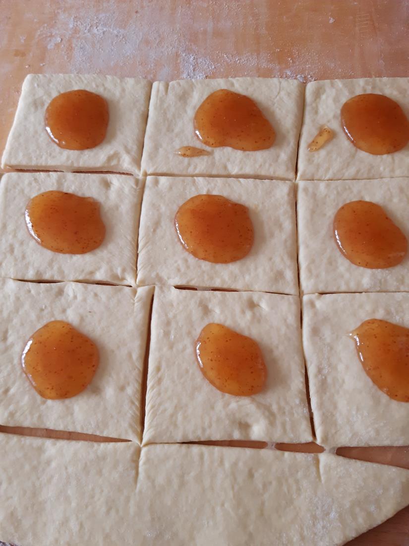 Če vam je ljubše valjanje kot v našem primeru lahko testo zvaljate, izrežete kvadrate, katere obložite z marmelado in jih zaprete podobno kot v prej opisanem postopku.