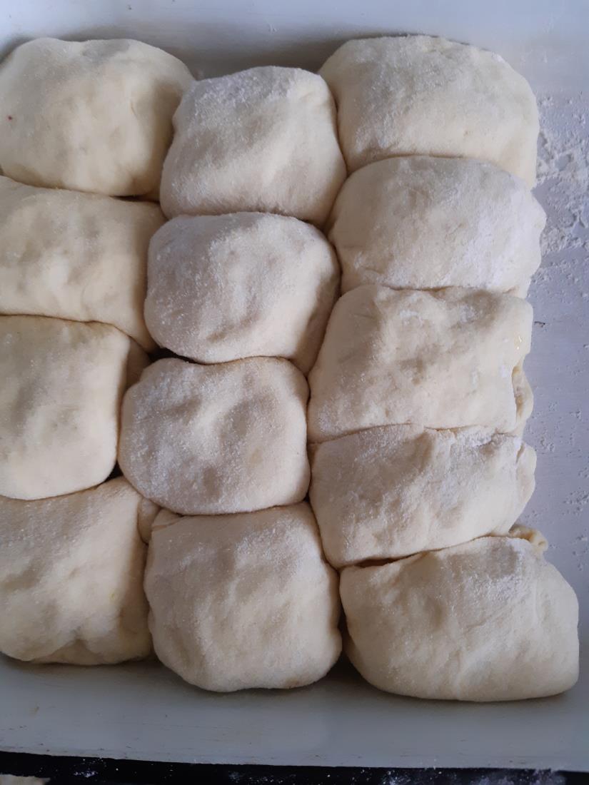 Oblikovane buhteljne polagamo v pekač, katerega smo naoljili in potrosili z ostro moko.