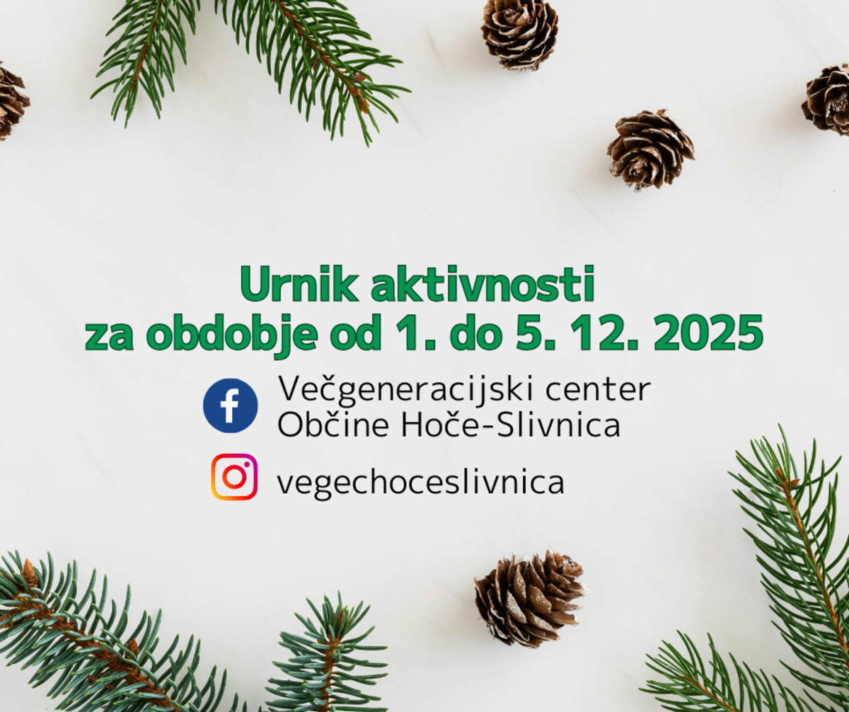 Z vami delimo urnik aktivnosti, ki bodo potekale v prostorih Večgeneracijskega centa Občine Hoče-Slivnica od 1. do 5. 12. 2025.