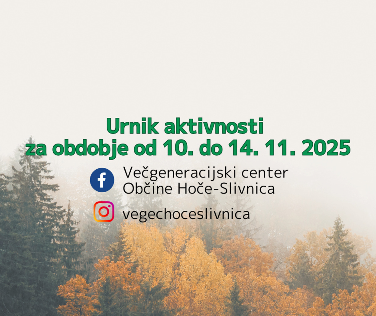 Z vami delimo urnik aktivnosti, ki bodo potekale v prostorih Večgeneracijskega centa Občine Hoče-Slivnica od 10. do 14. 11. 2025.