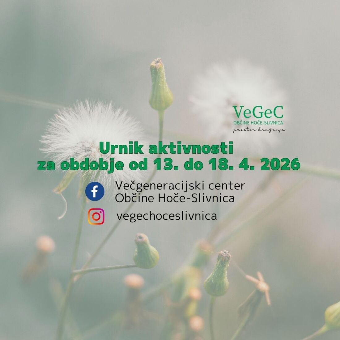 Z vami delimo urnik aktivnosti, ki bodo potekale v prostorih Večgeneracijskega centa Občine Hoče-Slivnica od 13. do 18. 4. 2026.