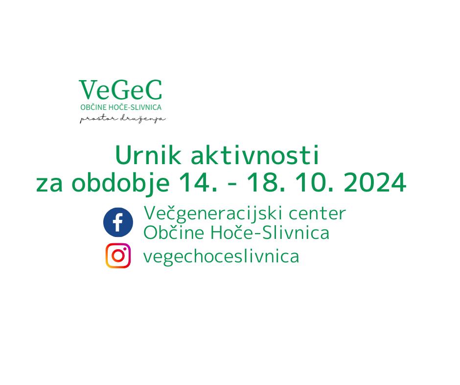 Urnik aktivnosti VeGeC OHS za obdobje od 14. do 18. 10. 2024