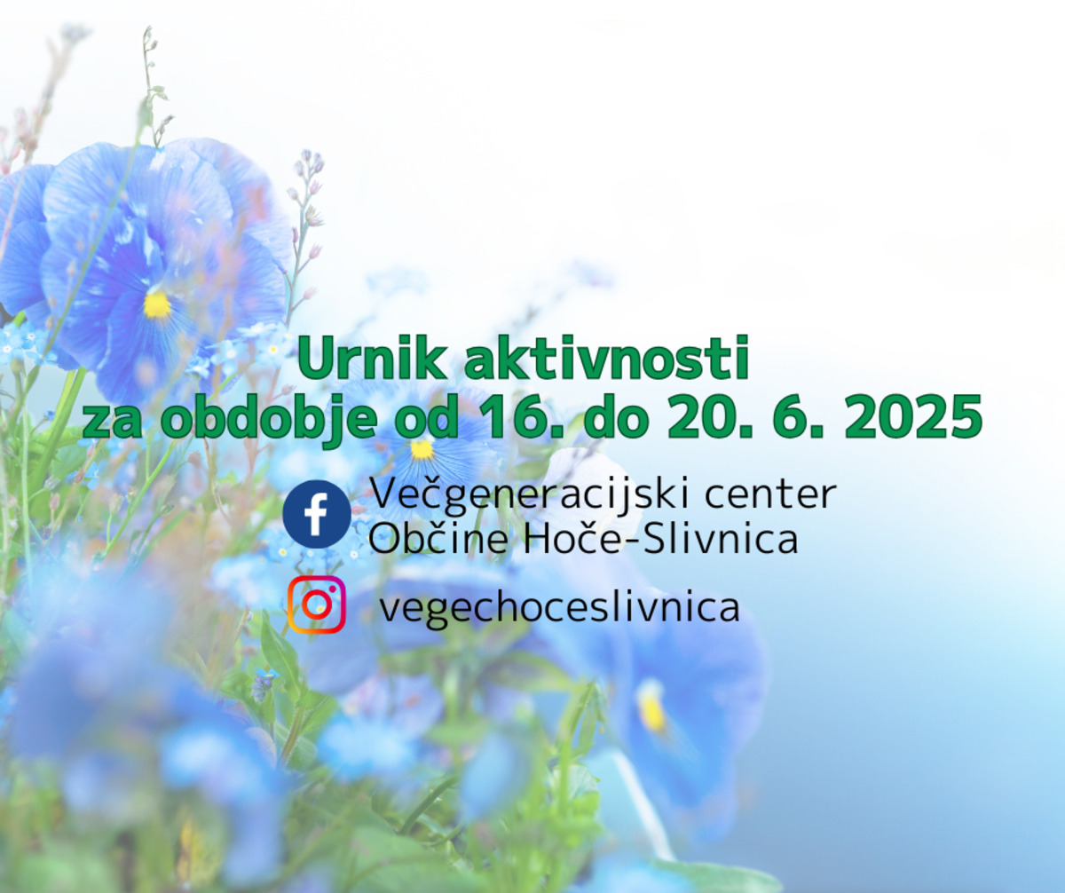 Z vami delimo urnik aktivnosti, ki bodo potekale v prostorih Večgeneracijskega centra Občine Hoče-Slivnica med 16. do 20. 6. 2025.