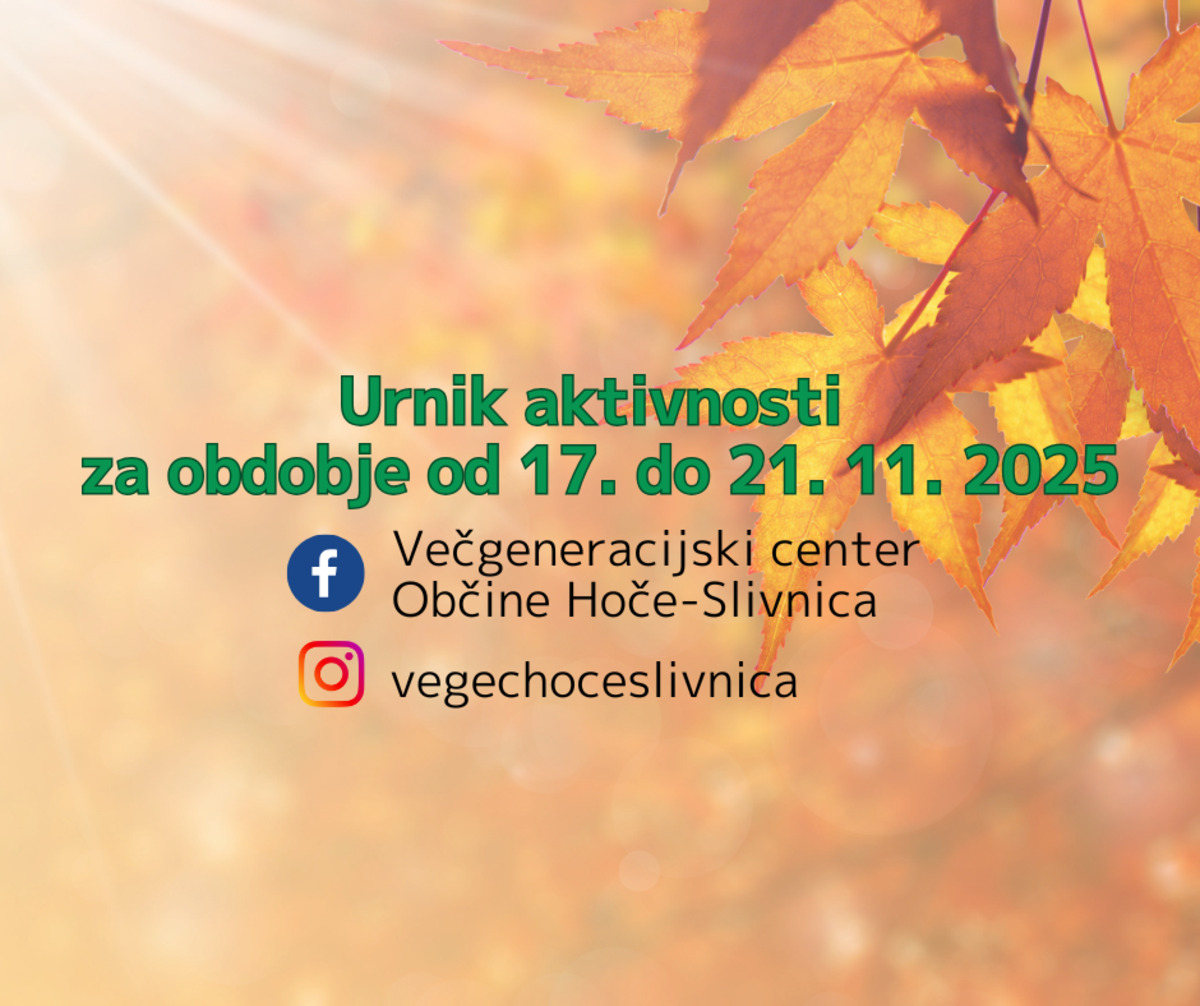 Z vami delimo urnik aktivnosti, ki bodo potekale v prostorih Večgeneracijskega centa Občine Hoče-Slivnica od 17. do 21. 11. 2025.