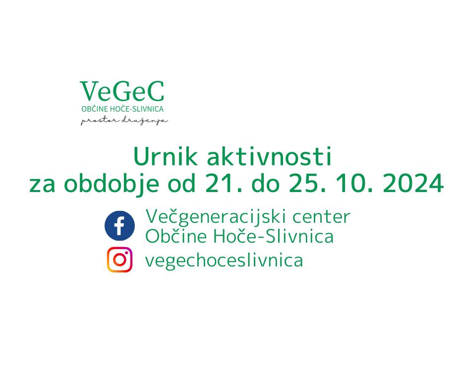 Z vami delimo urnik aktivnosti, ki bodo potekale v prostorih Večgeneracijskega centra Občine Hoče-Slivnica med 21. in 25. 10. 2024.