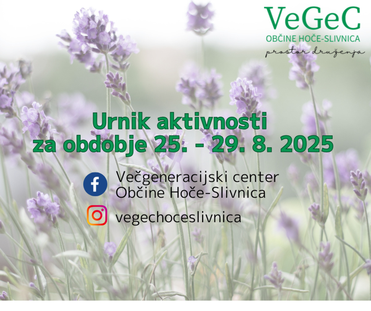 Z vami delimo urnik aktivnosti, ki bodo potekale v prostorih Večgeneracijskega centa Občine Hoče-Slivnica od 25. do 29. 8. 2025.