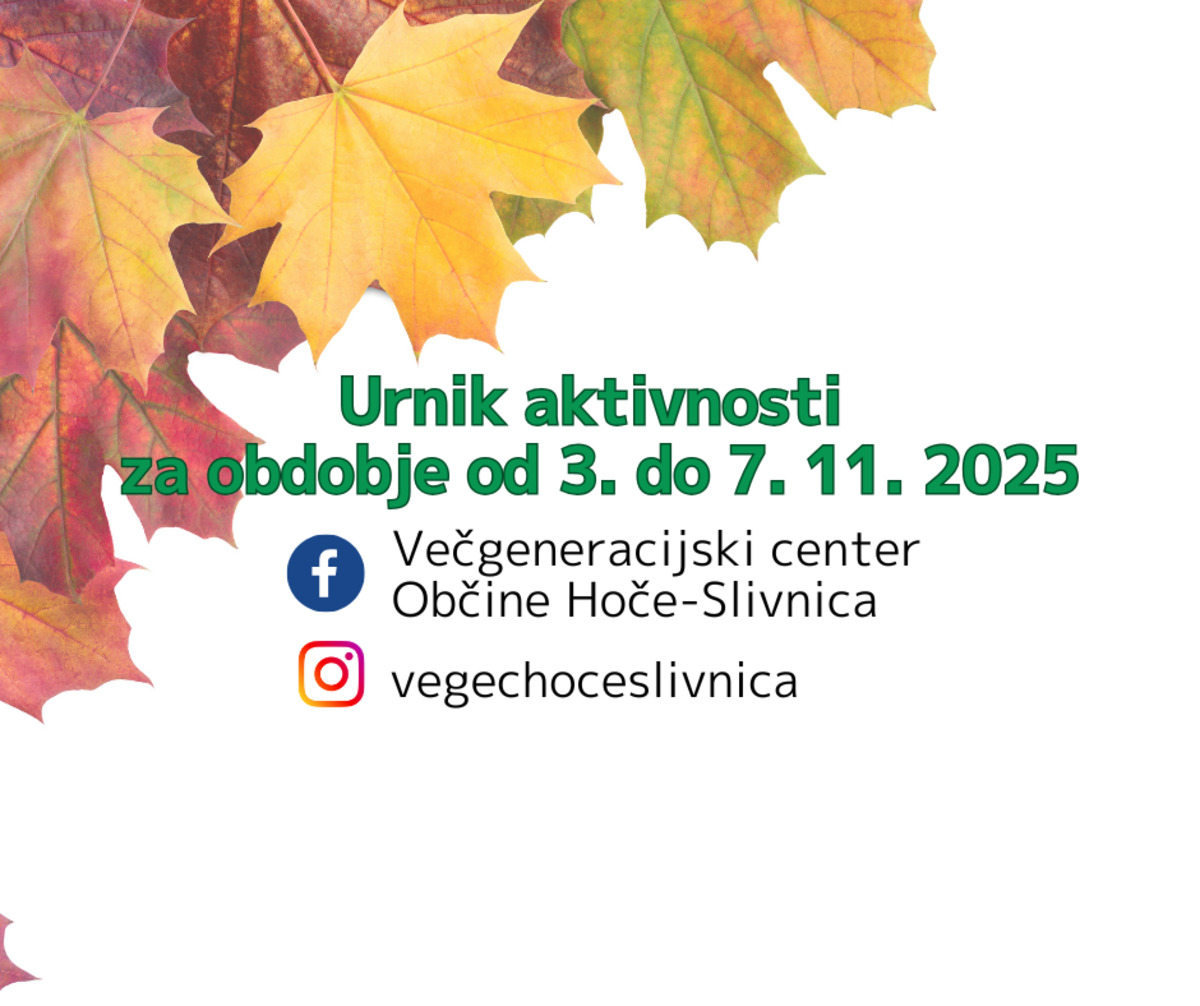 Z vami delimo urnik aktivnosti, ki bodo potekale v prostorih Večgeneracijskega centa Občine Hoče - Slivnica od 3. do 7. 11. 2025.