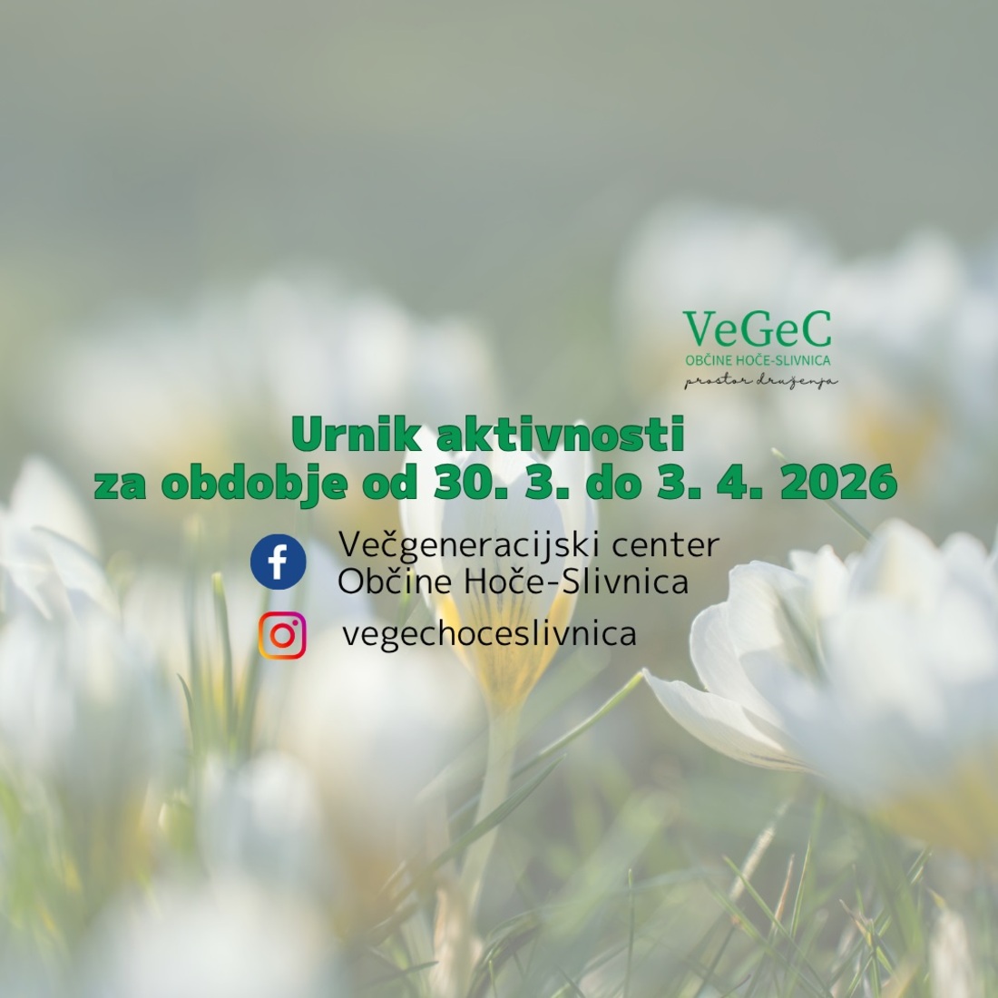 Z vami delimo urnik aktivnosti, ki bodo potekale v prostorih Večgeneracijskega centa Občine Hoče-Slivnica od 30. 3. do 3. 4. 2026.