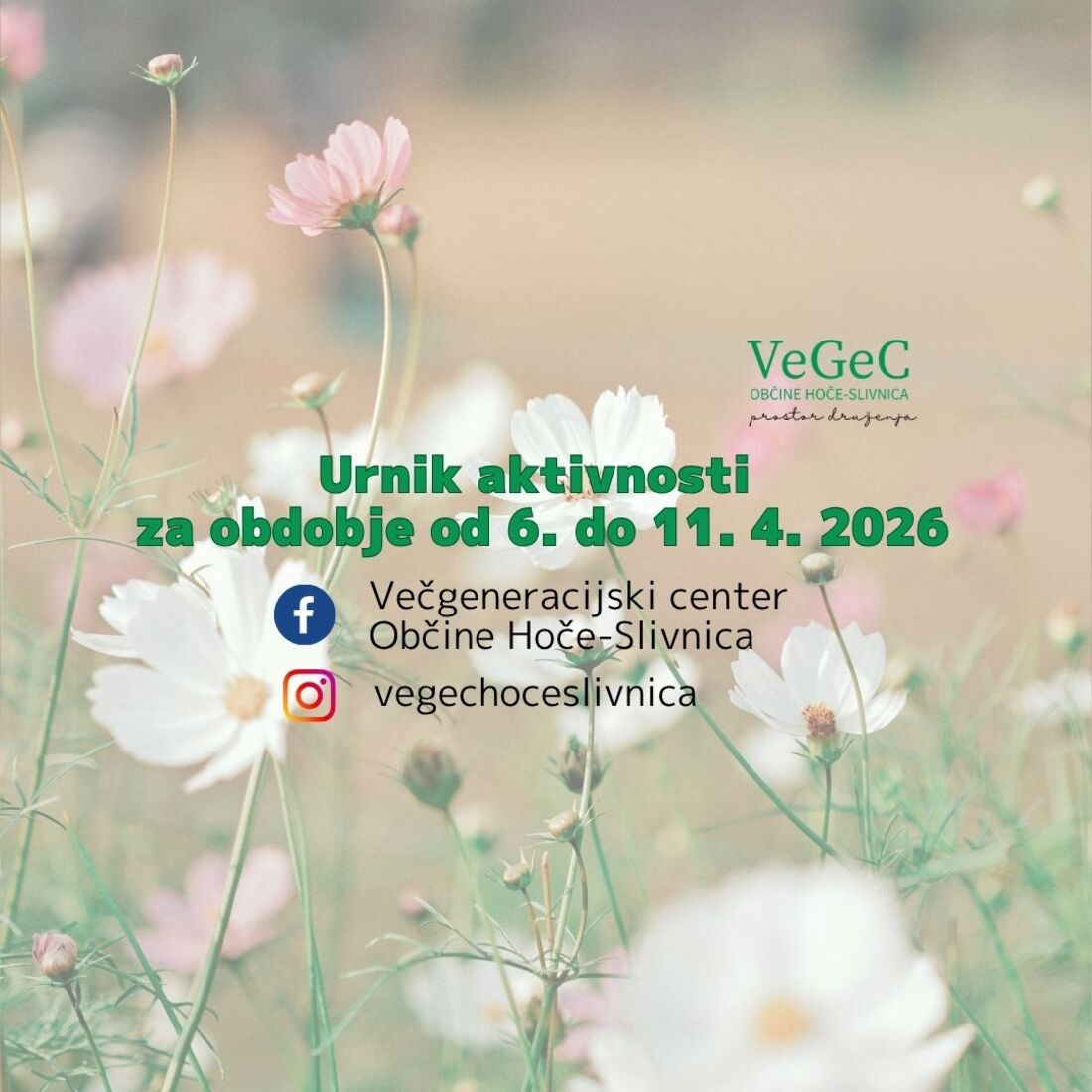 Z vami delimo urnik aktivnosti, ki bodo potekale v prostorih Večgeneracijskega centa Občine Hoče-Slivnica od 6. do 11. 4. 2026.