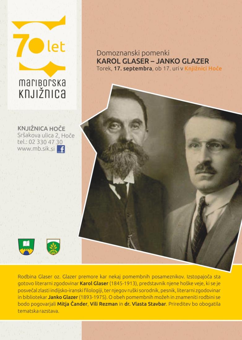 Vljudno vabljeni na domoznanske pomenke, na temo Karol Glaser - Janko Glaser, ki bodo v torek 17.9.2019 ob 17.00 uri v Kulturnem domu v Hočah (Pohorska cesta 15, 2311 Hoče).